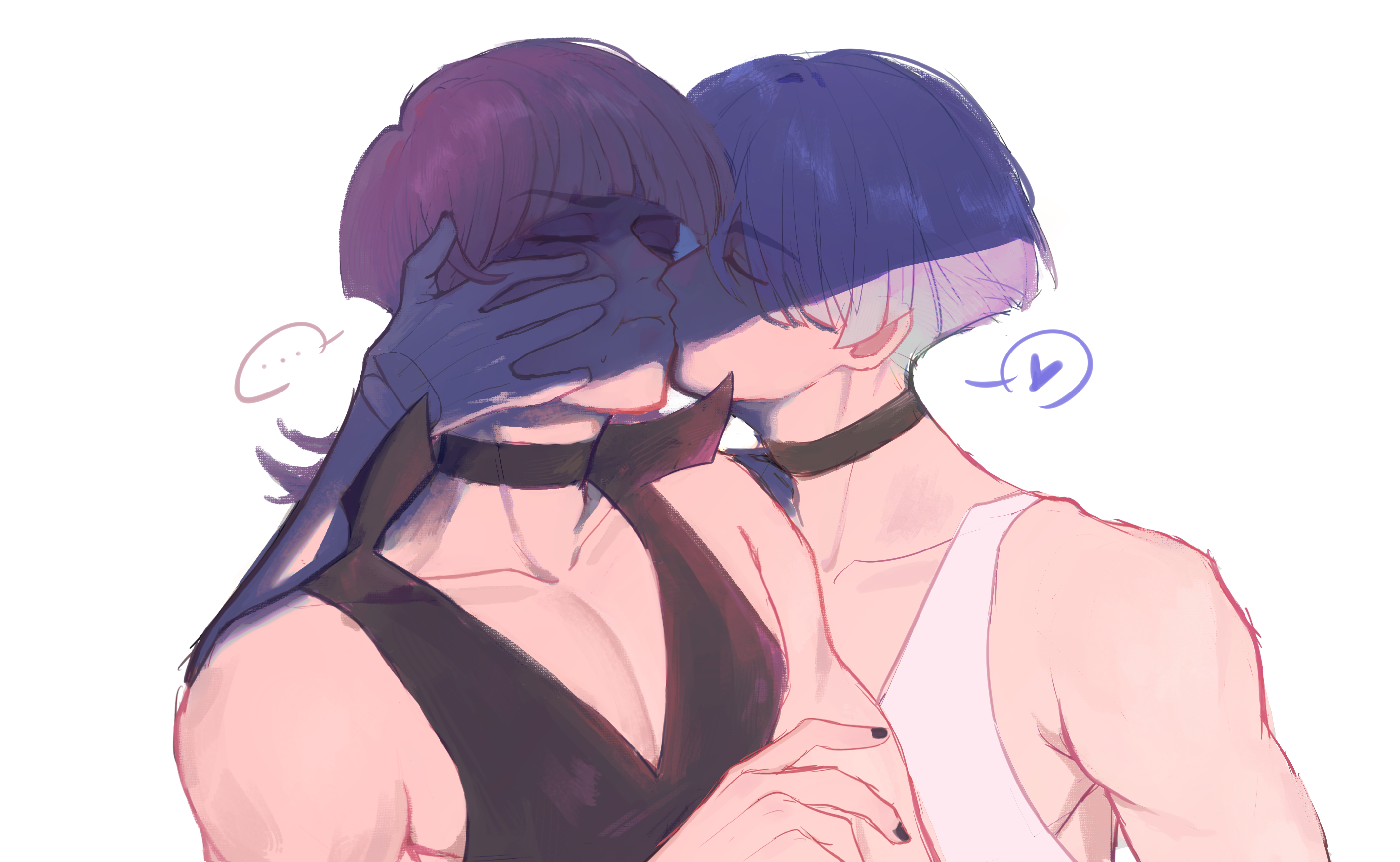 ... 2boys arm_up bare_shoulders black_choker black_jumpsuit black_nails blue_hair brothers choker closed_eyes closed_mouth clothing_cutout collarbone commentary english_commentary glove_cutout gloves heart highres incest jumpsuit kiss male_focus multiple_boys nail_polish panty_&_stocking_with_garterbelt pectoral_cleavage pectorals pink_hair polyester_(psg) polyurethane_(psg) ray5green siblings speech_bubble spoken_ellipsis spoken_heart upper_body white_gloves white_jumpsuit yaoi