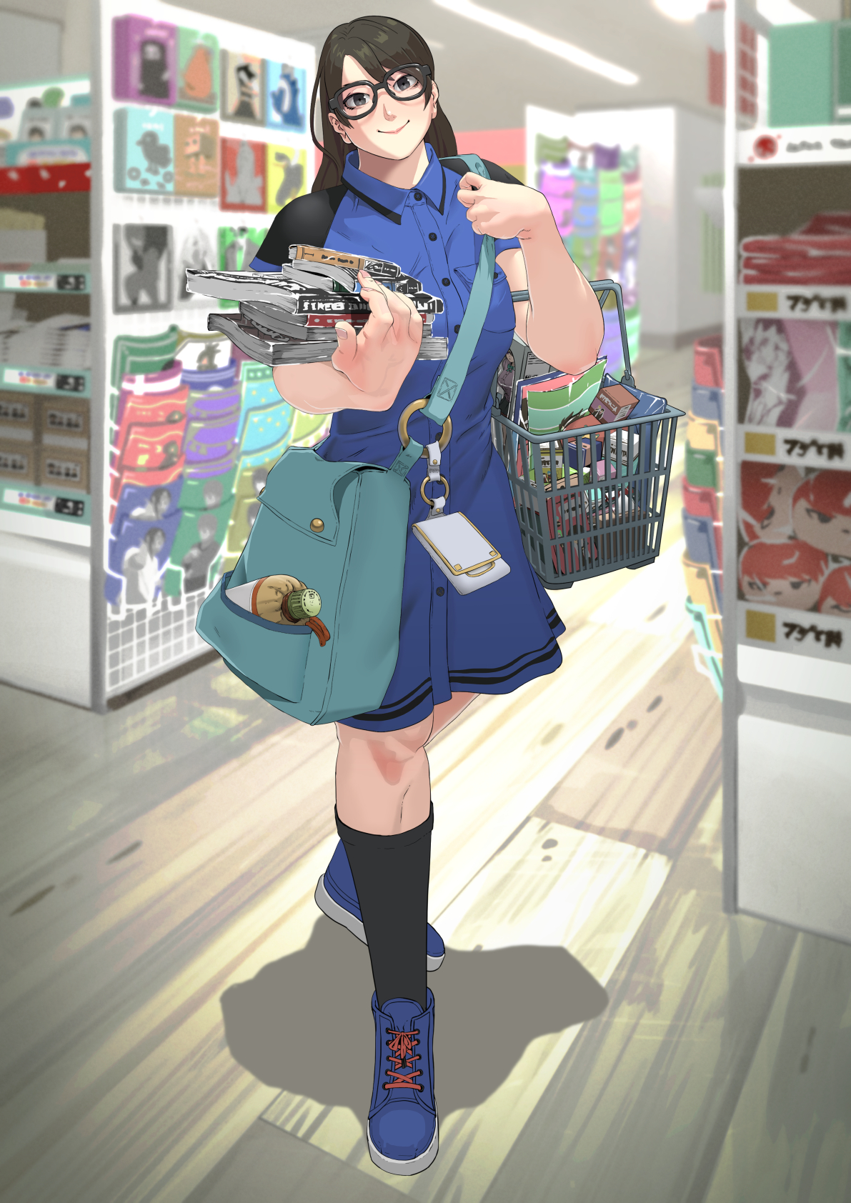 1girl bag basket black_socks blue_dress blue_shoes book brown_hair convenience_store dress full_body glasses grey_eyes groceries grocery_store highres holding holding_basket holding_book holding_manga kneehighs long_hair looking_at_viewer manga_(object) messenger_bag muscular muscular_female original otaku school_uniform shoes shop shopping shopping_basket shoulder_bag smile sneakers socks standing supermarket tsukunekinako