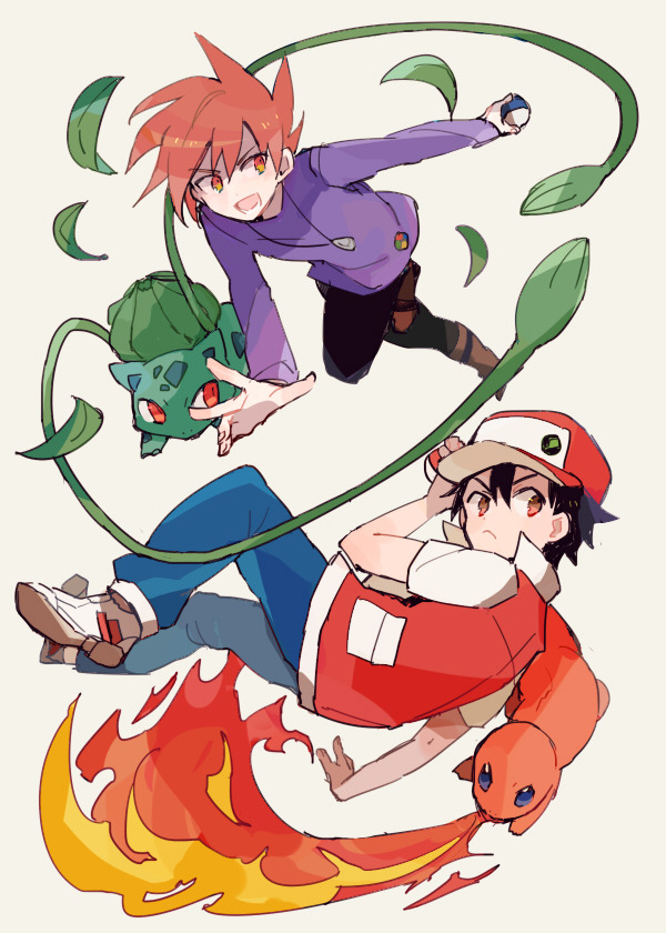 2boys arm_up black_hair blue_eyes blue_oak blue_pants breath_weapon breathing_fire brown_eyes brown_hair charmander closed_mouth collared_jacket colored_skin crew_neck denim fire floating frown gen_1_pokemon great_ball hair_between_eyes holding holding_poke_ball jacket jeans jewelry leaf long_sleeves looking_to_the_side male_focus multiple_boys necklace nintendo open_mouth orange_skin outstretched_arm pants parted_bangs plant poke_ball pokemon pokemon_(creature) pokemon_red/green/blue/yellow popped_collar purple_shirt red_(pokemon) red_eyes red_jacket shirt shoes short_hair sideways_glance smcms-m vines white_shoes