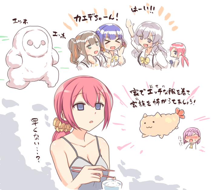 >_< 5girls :3 :d arm_up bare_shoulders blue_hair blunt_bangs blunt_ends blush bob_cut bow bowtie breasts brown_hair camisole chopsticks cleavage collarbone collared_shirt commentary emphasis_lines empty_eyes green_eyes grey_camisole grey_eyes grey_hair gyaru hair_between_eyes hair_ornament hair_scrunchie hand_up hands_up holding holding_chopsticks imagining kinoshita_kaede kogal kohibari_kurumi kuase long_hair looking_ahead looking_at_another low_ponytail low_twintails medium_breasts mizuka_academy_school_uniform multicolored_hair multiple_girls nose_blush open_mouth orange_hair ozato_fumika pink_hair ponytail red_hair school_uniform scrunchie shiraishi_chika shirt short_hair side_ponytail simple_background sketch smile sweatdrop tanikaze_amane tenshi_souzou_re-boot! translation_request twintails two-tone_hair upper_body v-shaped_eyebrows white_background white_shirt yellow_bow yellow_bowtie yellow_scrunchie