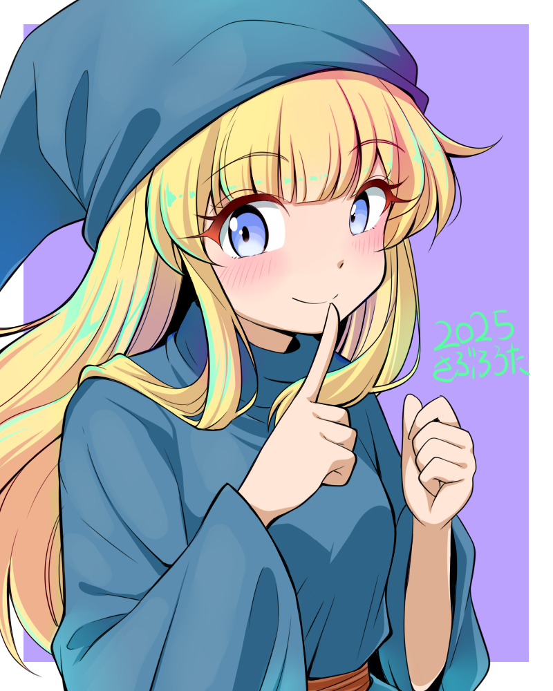 1girl blonde_hair blue_eyes blue_hat blue_robe blunt_bangs blush border closed_mouth commentary_request eyelashes finger_to_mouth hat long_hair looking_at_viewer outside_border purple_background puyopuyo robe saburouta_(hox-666) smile solo white_border wide_sleeves witch_(puyopuyo)