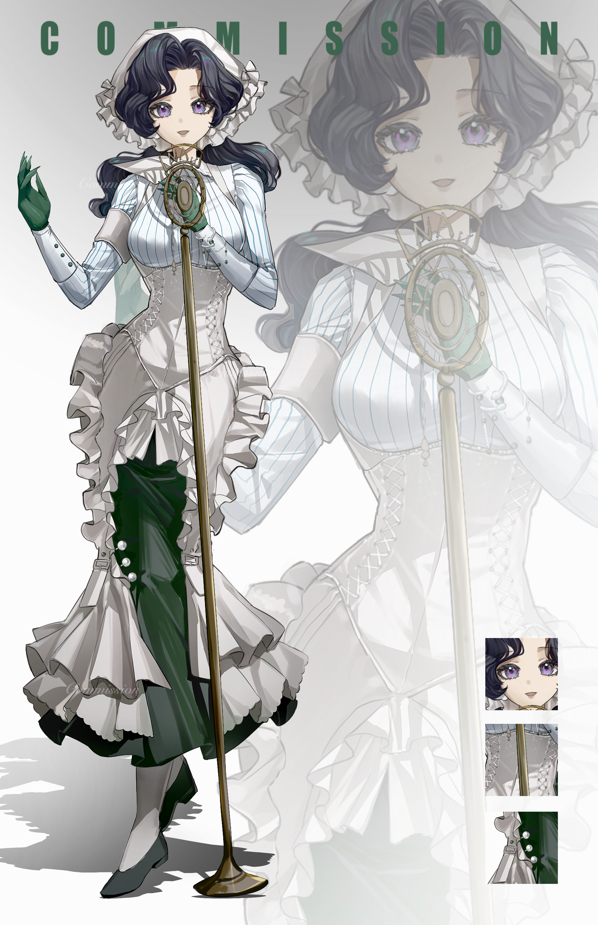 1girl :d absurdres anjo_nala black_hair black_shoes black_skirt breasts coif corset full_body gloves green_gloves grey_background hands_up hat highres large_breasts long_hair long_skirt looking_at_viewer microphone microphone_stand neckerchief open_mouth pantyhose pinstripe_pattern pinstripe_shirt purple_eyes reverse:1999 shirt shoes skirt smile striped_clothes striped_shirt vertical-striped_clothes vertical-striped_shirt vintage_microphone white_corset white_hat white_neckerchief white_pantyhose white_shirt yushu_eureka zoom_layer