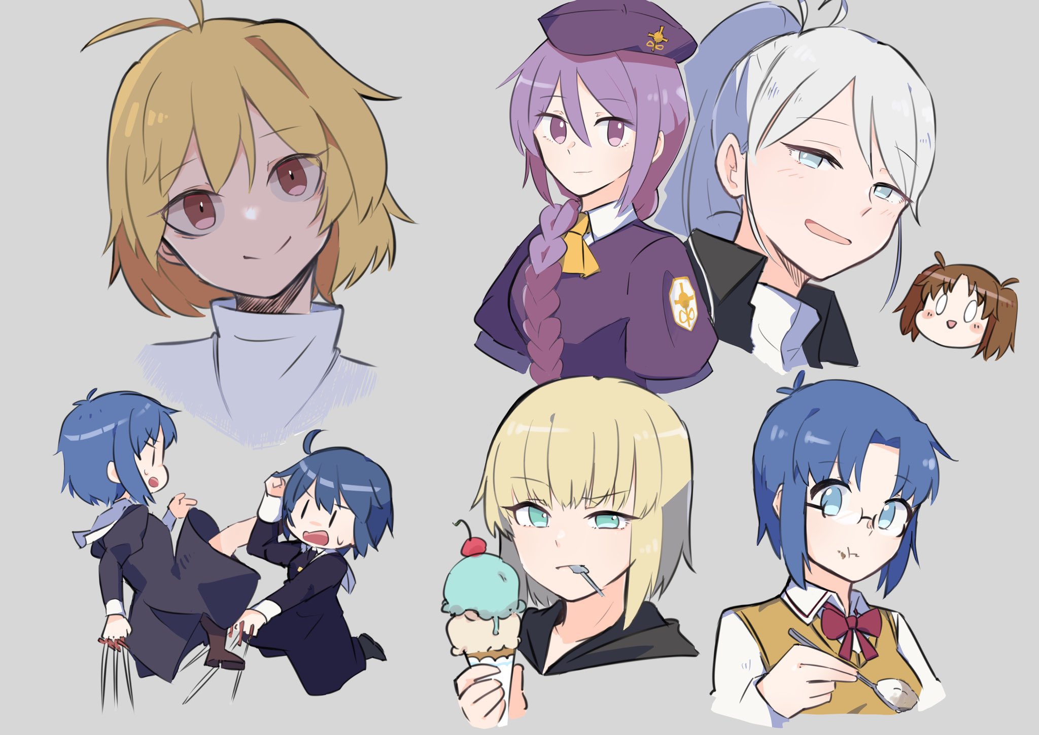 1boy 6+girls ahoge arcueid_brunestud atlas_academy_uniform beret black_keys_(type-moon) blonde_hair blush braid braided_ponytail brown_hair chibi chibi_inset ciel_(tsukihime) dual_persona fighting floating_clothes floating_hair food glasses green_eyes grey_eyes grey_hair hat highres holding holding_weapon ice_cream kouta_(kesigomutopen) looking_at_viewer mario_gallo_bestino melty_blood multiple_girls nun purple_eyes purple_hair red_eyes riesbyfe_stridberg short_hair sion_eltnam_(type-moon) sion_eltnam_atlasia smile spoon sweat sweater tsukihime tsukihime_(remake) tunic turtleneck turtleneck_sweater twintails utensil_in_mouth vest weapon yellow_vest yumizuka_satsuki