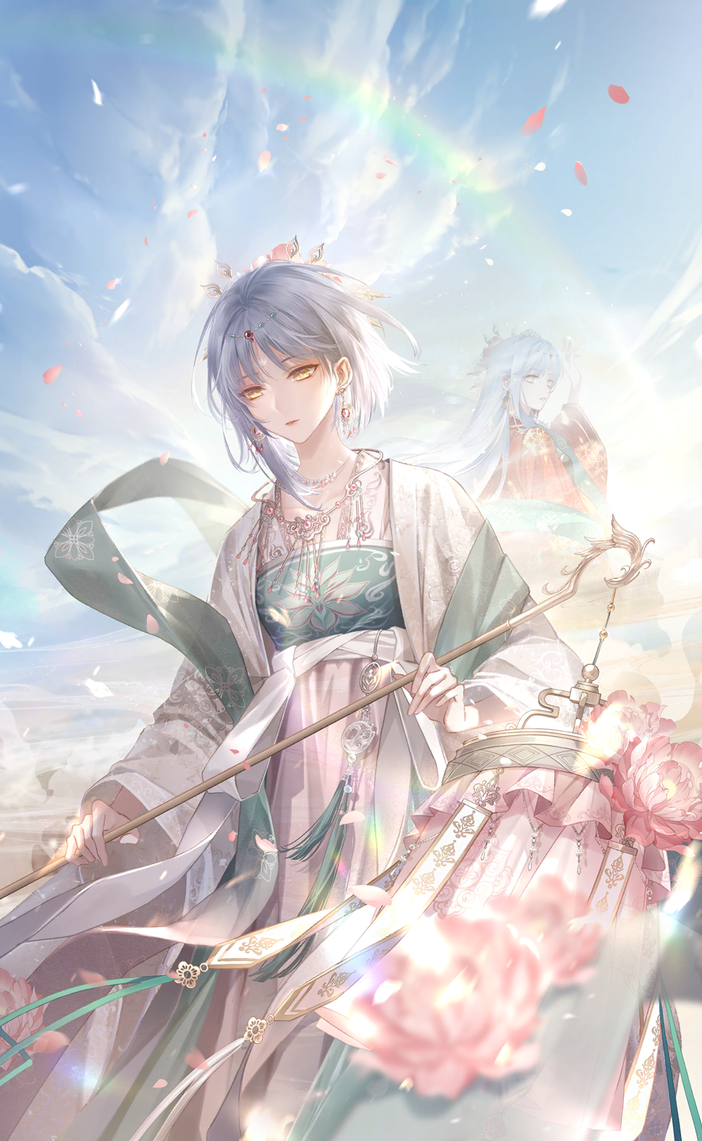 1girl aqua_shawl artist_request blue_sky camellia chinese_clothes circlet cloud cowboy_shot day dual_persona earrings expressionless flower game_cg glamorous_nights_(shining_nikki) grey_hair hair_ornament hairpin hanfu highres holding holding_lantern jewelry lake lantern light_particles long_sleeves looking_ahead mountain multiple_hairpins nikki_(series) official_alternate_color official_art outdoors pink_flower pink_hanfu projected_inset rain robe shawl shining_nikki short_hair_with_long_locks single_sidelock sky solo spring_(season) sunlight white_robe wide_sleeves yellow_eyes yexiao_(shining_nikki)