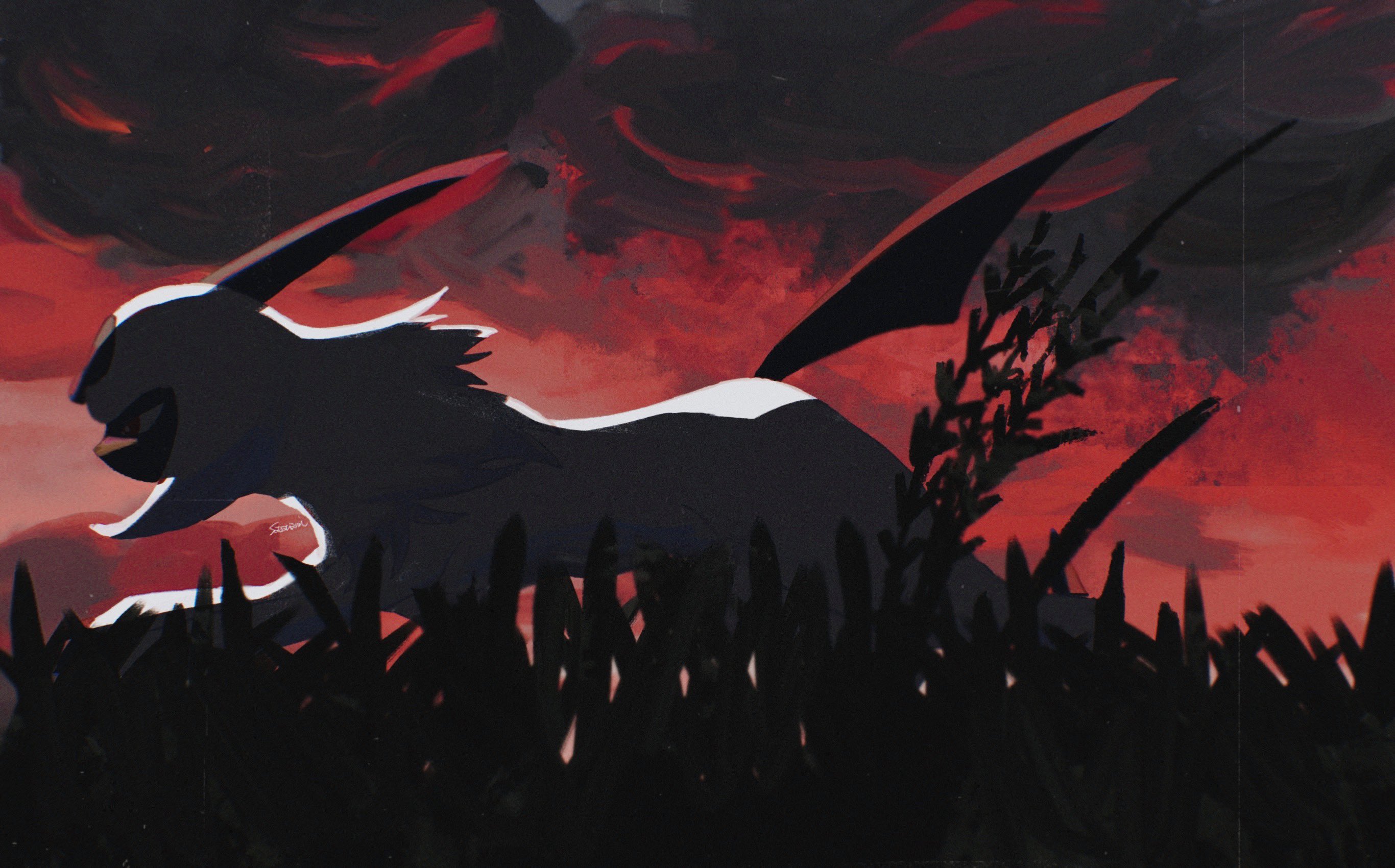 absol animal_focus body_fur flower gen_3_pokemon highres horns neck_fur nintendo no_humans outdoors pokemon pokemon_(creature) pokemon_focus red_sky sazanami_(rsrm1) single_horn sky solo tail white_fur