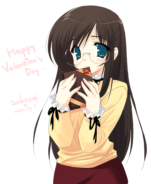 1girl 2000s_(style) archived_source artist_name black_ribbon blue_eyes blue_pupils box box_of_chocolates brown_hair collar cowboy_shot emily_(pure_dream) english_text frilled_collar frilled_sleeves frills glass happy_valentine holding holding_box impasto light_blush long_hair looking_at_viewer neck_ribbon original red_skirt ribbon rimless_eyewear round_eyewear shirt simple_background skirt sleeve_ribbon small_pupils smile solo split_mouth straight_hair valentine very_long_hair white_background yellow_shirt yellow_sleeves