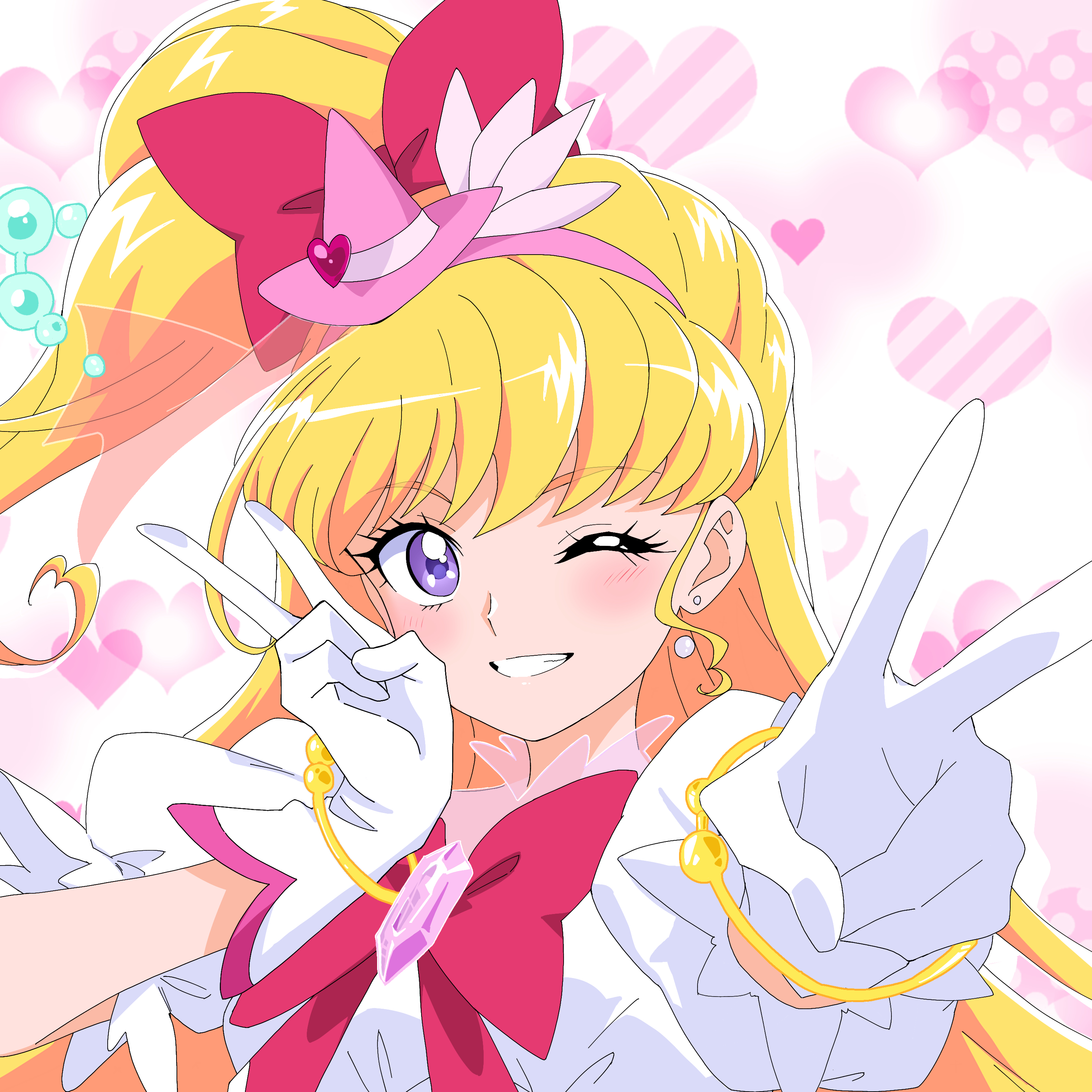 1girl absurdres asahina_mirai blonde_hair bow bracelet cure_miracle double_v earrings floating_hair gem gloves grin hair_bow hairband hat heart heart_earrings high_side_ponytail highres jewelry long_hair looking_at_viewer mini_hat mini_witch_hat one_eye_closed pink_gem pink_hairband pink_hat precure purple_eyes red_bow red_gem rpca shirt short_sleeves smile solo upper_body v very_long_hair white_gloves white_shirt witch_hat