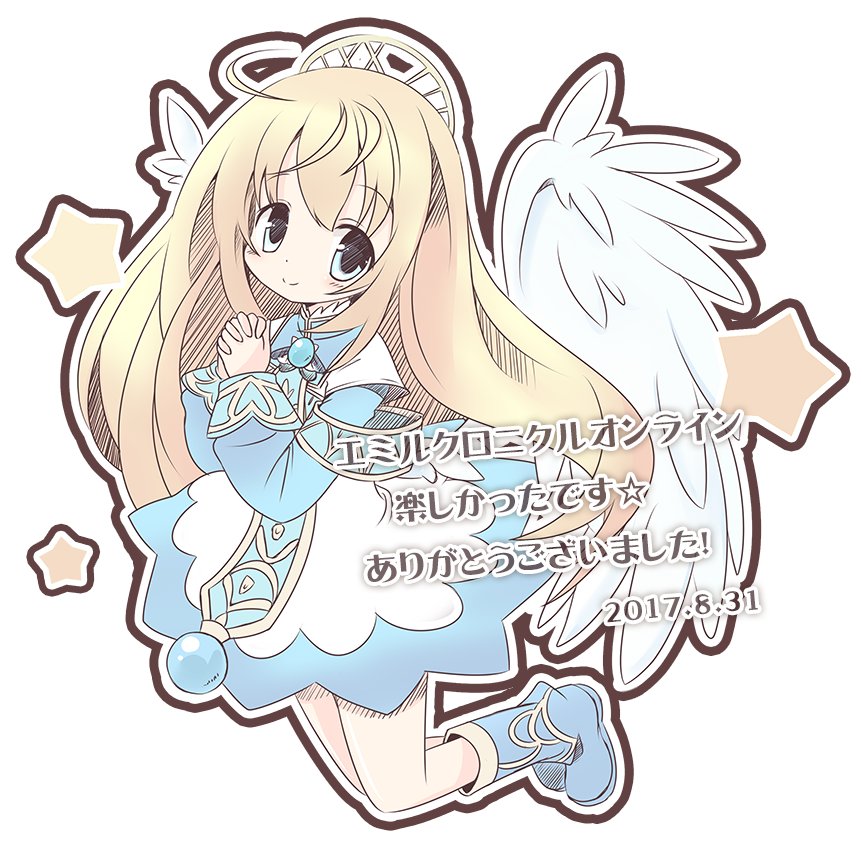 1girl ahoge akino_sakura angel blonde_hair blue_boots blue_dress blue_eyes boots dated dress emil_chronicle_online halo long_hair praying solo star_(symbol) tita_(eco) two-tone_dress white_background white_dress white_wings wings