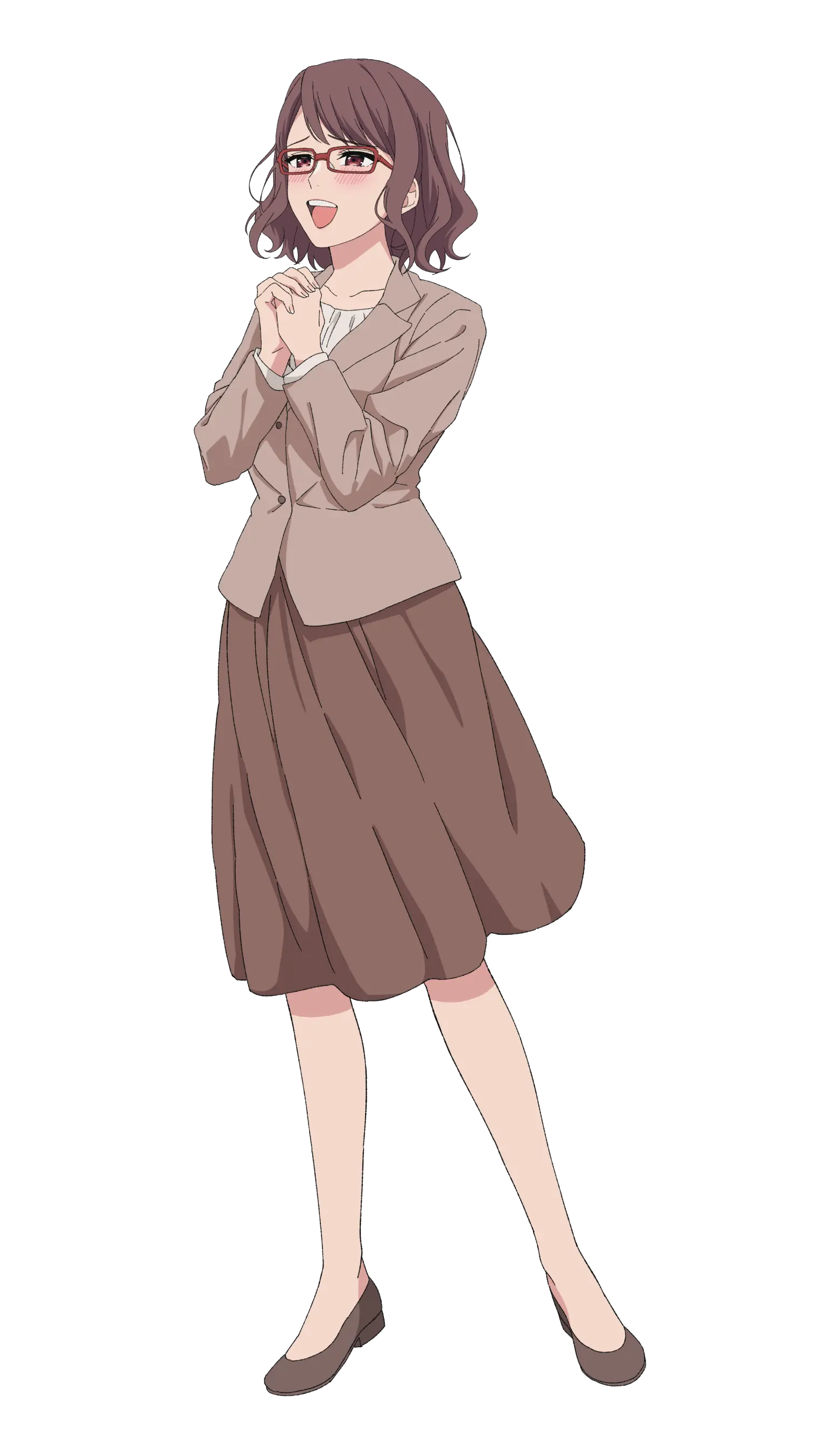 1girl absurdres blush brown_hair brown_jacket brown_skirt glasses hands_up highres jacket long_sleeves looking_up makuwa_yuuri official_art open_mouth red_eyes shirt shoes short_hair skirt smile solo teacher transparent_background white_shirt witch_watch