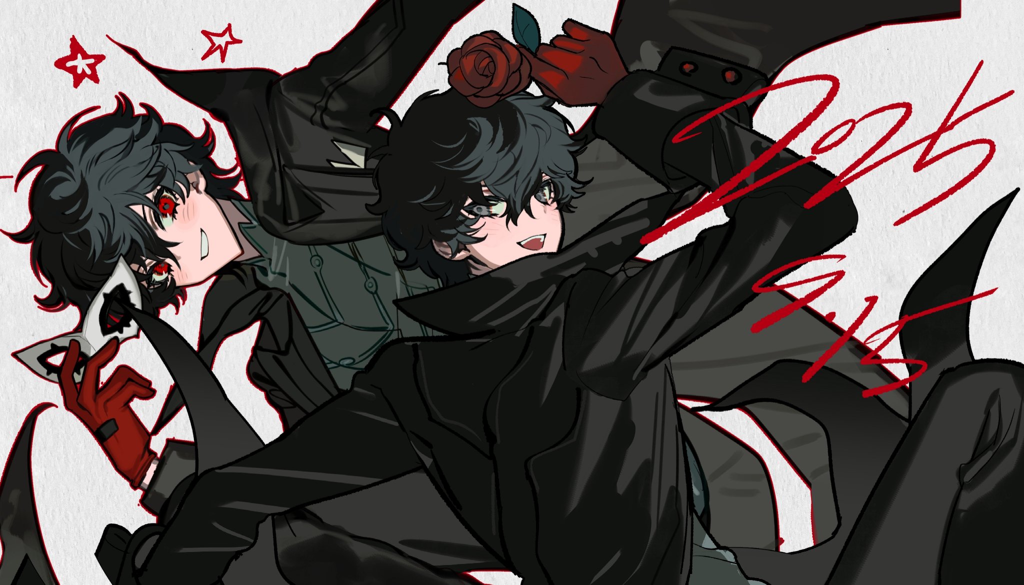 1boy amamiya_ren black_coat black_eyes black_hair black_shirt coat dated domino_mask dual_persona eye_mask flower from_behind gloves grin hair_between_eyes hand_up highres holding holding_flower holding_mask hxiangchidanta joker_(persona_5) looking_at_another looking_at_viewer mask messy_hair open_mouth persona persona_5 red_eyes red_flower red_gloves red_rose rose shirt short_hair simple_background smile star_(symbol) teeth turning_head upper_body upper_teeth_only white_background white_mask