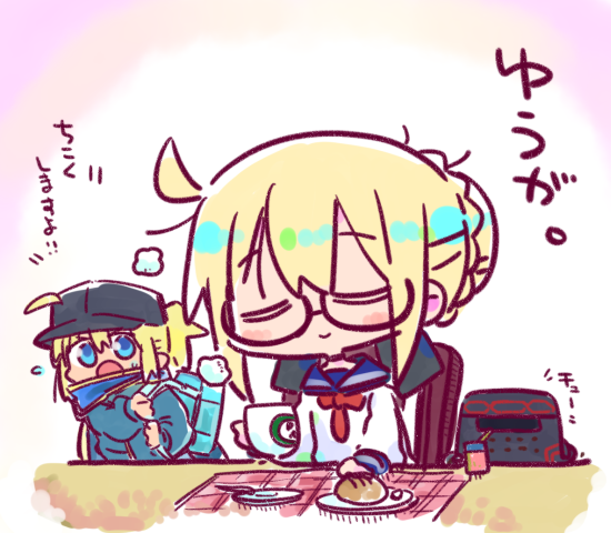2girls :o ahoge artoria_pendragon_(fate) bag black-framed_eyewear black_hat blonde_hair blue_jacket blue_sailor_collar blue_scarf braid bread chair chibi closed_eyes closed_mouth commentary_request fate/grand_order fate_(series) flat_cap flying_sweatdrops food glasses hair_between_eyes hair_bun hair_through_headwear hat jacket kasuga_yuuki long_sleeves multiple_girls mysterious_heroine_x_alter_(fate) mysterious_heroine_xx_(fate) neckerchief on_chair open_mouth plate ponytail puffy_long_sleeves puffy_sleeves red_neckerchief sailor_collar scarf school_bag school_uniform semi-rimless_eyewear serafuku shirt sitting translation_request under-rim_eyewear white_shirt
