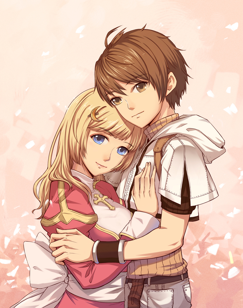 1boy 1girl back_bow belt blonde_hair blue_eyes bow breasts brown_belt brown_eyes brown_hair brown_shirt chinese_commentary closed_mouth commentary_request crescent crescent_hair_ornament cropped_jacket dress hair_ornament high_priest_(ragnarok_online) hug hunter_(ragnarok_online) jacket juliet_sleeves jun_(goodgun7) long_hair long_sleeves looking_at_viewer medium_breasts pants petals pink_background pink_dress puffy_sleeves ragnarok_online sash shirt short_hair short_sleeves smile two-tone_dress upper_body white_bow white_dress white_jacket white_pants white_sash