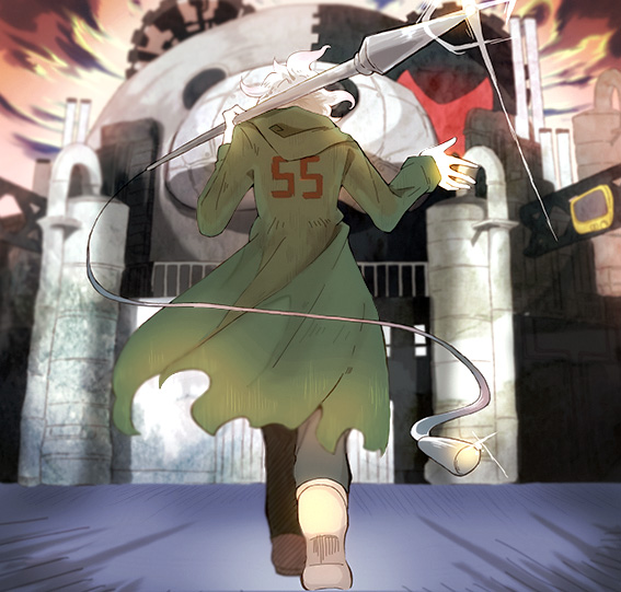 1boy black_pants building cloud commentary_request danganronpa_(series) danganronpa_2:_goodbye_despair from_behind full_body glint green_jacket hirai_(kagamine) holding holding_polearm holding_weapon hood hood_down hooded_jacket jacket komaeda_nagito long_sleeves male_focus monokuma over_shoulder pants polearm shoes sky solo spear spoilers weapon weapon_over_shoulder white_hair