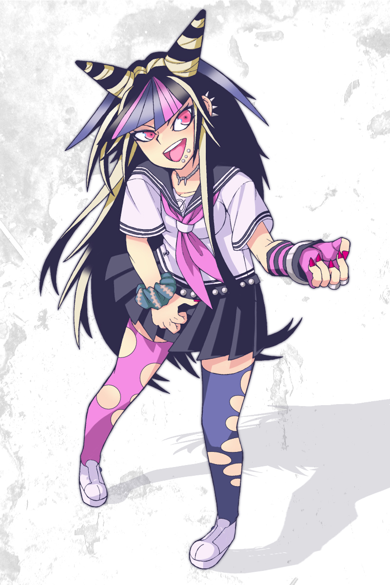 1girl anti-earth_bomb black_hair black_sailor_collar black_skirt blue_hair blue_streaks collared_shirt commentary_request danganronpa_(series) danganronpa_2:_goodbye_despair ear_piercing elbow_gloves eyelashes face_piercing fingerless_gloves full_body gloves hair_horns highres jewelry long_hair mioda_ibuki mismatched_thighhighs mouth_piercing multicolored_hair nail_polish necklace open_mouth piercing pink_eyes pink_hair pink_streaks red_nails sailor_collar scrunchie shadow shirt short_sleeves single_elbow_glove single_fingerless_glove skirt smile socks solo streaked_hair striped_clothes striped_gloves teeth thighhighs torn_clothes torn_thighhighs two-tone_gloves upper_teeth_only white_hair white_shirt white_socks wrist_scrunchie