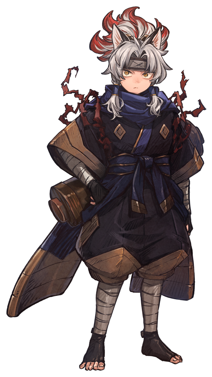 1boy animal_ears arm_at_side arm_wrap artist_request bandai_namco black_gloves black_kimono black_pants black_socks blue_sash blue_scarf closed_mouth fingerless_gloves forehead_protector frown full_body gloves hair_tubes hand_on_own_hip highres impasto japanese_clothes kimono leg_wrap legs_apart looking_at_viewer low-tied_medium_hair medium_hair multicolored_hair ninja obi official_art pants parted_bangs ponytail puffy_pants red_hair sanpaku sash scarf scroll second-party_source shigin_(towa_and_the_guardians_of_the_sacred_tree) simple_background socks solo split_mouth standing tasuki three-quarter_sleeves toeless_socks toenails toes towa_and_the_guardians_of_the_sacred_tree transparent_background two-tone_hair white_hair wide_sleeves yellow_eyes