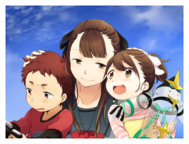 1boy 2girls aged_down blue_sky blunt_bangs blush bow bowtie brown_eyes brown_hair child chuo_tanegashima_high_school_uniform cloud day dress hair_ribbon headpat holding long_hair long_sleeves multiple_girls open_mouth outdoors photo_(object) pinafore_dress red_eyes red_hair ribbon robotics;notes school_uniform science_adventure senomiya_akiho senomiya_misaki senomiya_misaki_(teen) serafuku shirt short_hair siblings sisters sky sleeveless sleeveless_dress smile striped_clothes striped_shirt takana_(nanao) upper_body very_short_hair winter_uniform yashio_kaito yellow_dress