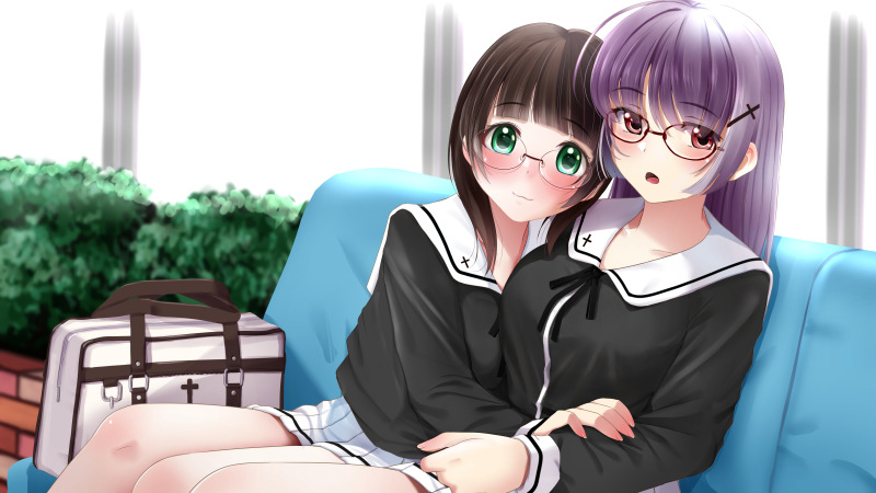 2girls bag black_shirt breasts brown_hair closed_mouth collarbone commentary_request couch day feet_out_of_frame glasses green_eyes hair_ornament indoors kozue_akari long_hair medium_breasts multiple_girls on_couch open_mouth original pleated_skirt purple_hair red-framed_eyewear red_eyes school_bag shirt sitting skirt sunlight white_skirt window yuri