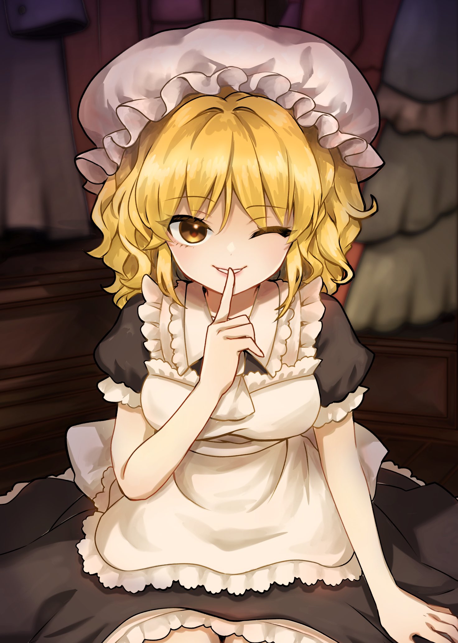 1girl apron ascot back_bow black_dress blonde_hair bow breasts cleaning_maid_(touhou) commentary_request dress finger_to_mouth frilled_apron frilled_dress frilled_shirt_collar frills hat highres indoors medium_breasts medium_hair mika_(alquermes) mob_cap one_eye_closed open_mouth parted_lips portrait_of_exotic_girls puffy_short_sleeves puffy_sleeves short_sleeves shushing sitting smile solo touhou waist_apron white_apron white_ascot white_bow white_hat yellow_eyes