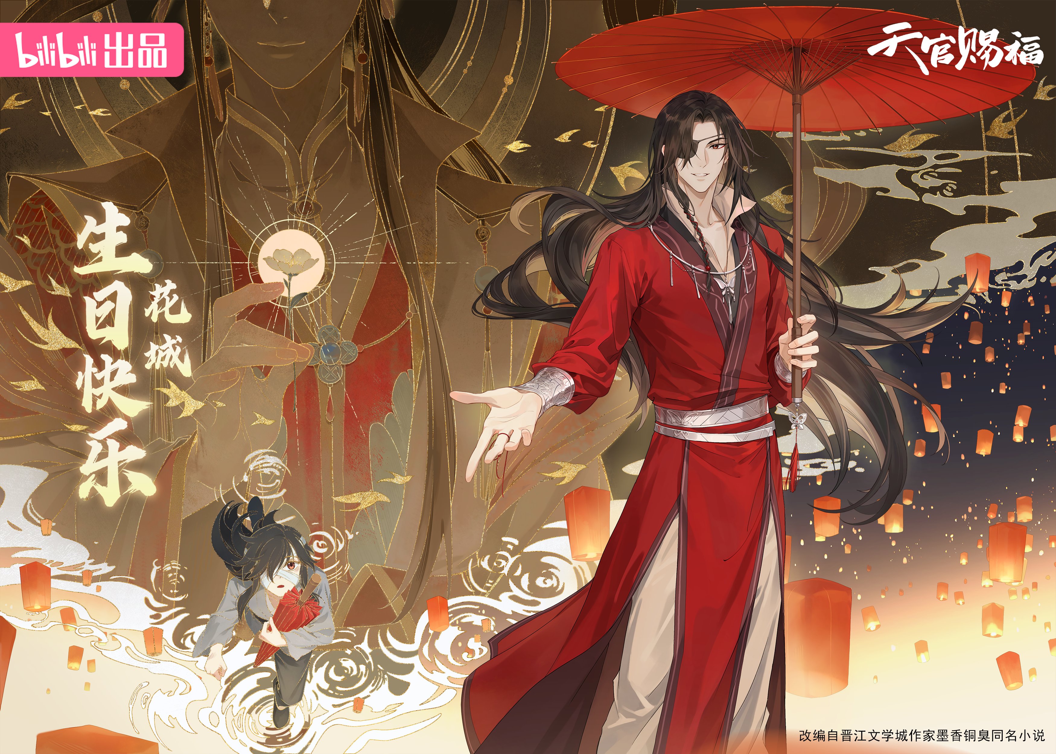 2boys absurdres age_comparison aged_down bandage_on_face bandage_over_one_eye bandaged_head bandages beads belt bird black_hair bracer braid brown_pants butterfly_necklace child chinese_clothes chinese_text closed_mouth collared_robe copyright_name earrings flower gem gold gold_trim gradient_sky grey_hanfu hair_beads hair_ornament halo hanfu highres holding holding_umbrella hua_cheng hua_cheng_(child) hua_cheng_(young) jewelry lantern long_hair long_sleeves male_focus multiple_boys night official_alternate_costume official_alternate_hairstyle official_art oil-paper_umbrella one_eye_covered open_mouth outstretched_hand pants paper_lantern red_eyes red_gem red_hanfu red_umbrella ripples shawl side_braid silver_belt sky smile string_around_finger tassel tassel_earrings tianguan_cifu umbrella very_long_hair water watermark white_flower wide-eyed xie_lian xie_lian_(flower_crowned_martial_god) yellow_shawl
