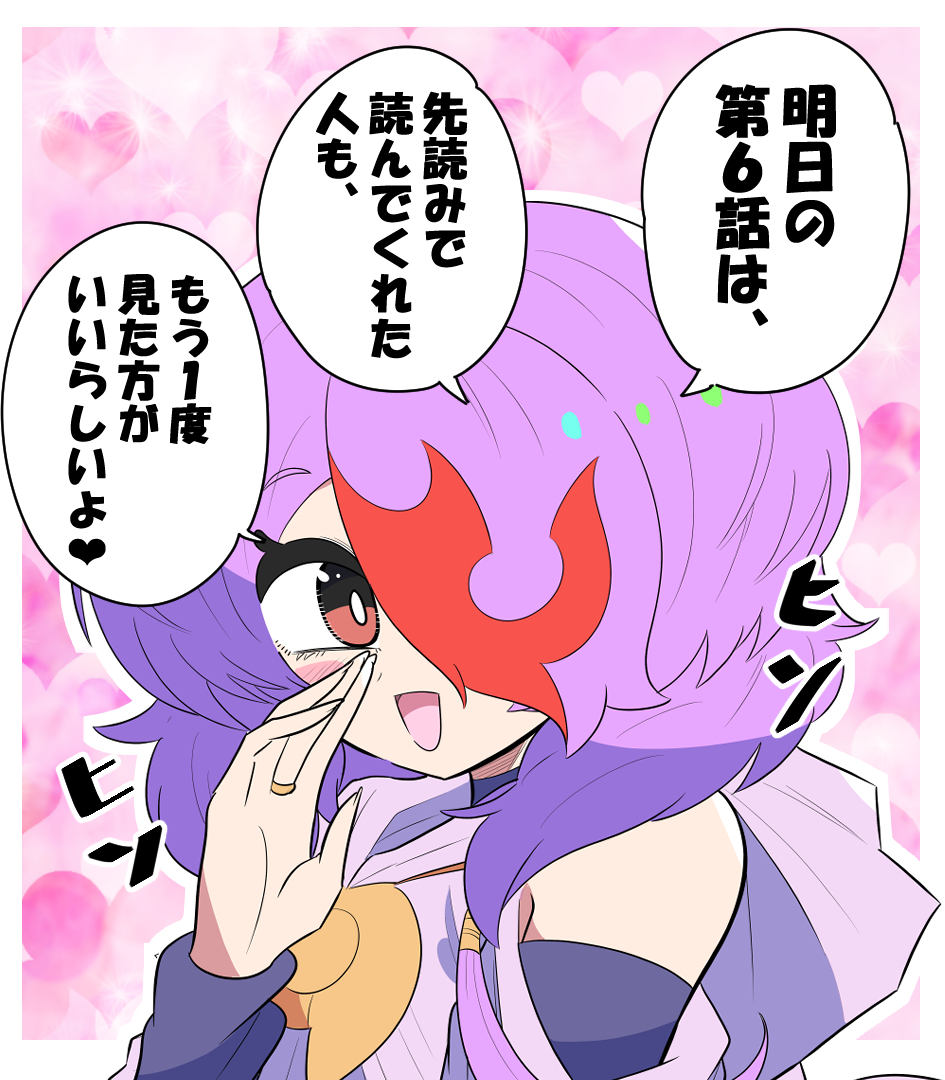 1boy blush_stickers border brown_eyes coat duel_masters duel_masters_gt glenturret_(duel_masters) hair_over_one_eye heart hood hooded_coat jewelry kikuzuma_hiroki low_side_ponytail multicolored_hair official_art open_mouth outside_border pink_coat purple_hair red_hair ring side_ponytail speech_bubble translation_request trap upper_body whispering white_border