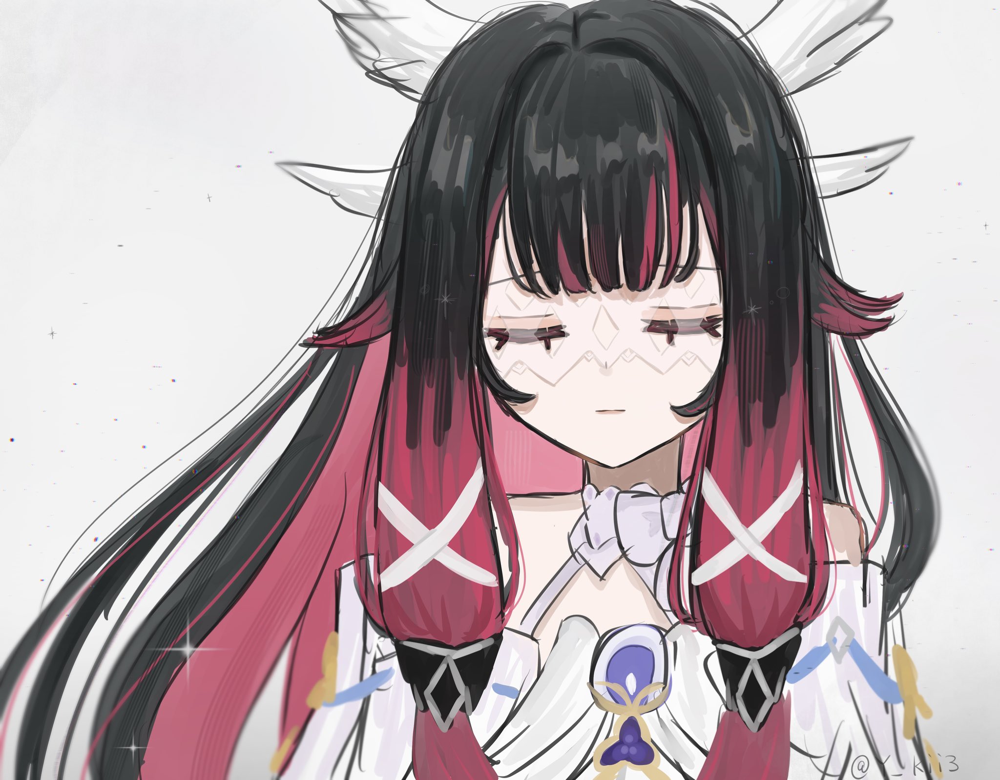 1girl bare_shoulders black_hair closed_eyes closed_mouth colored_inner_hair columbina_(genshin_impact) commentary_request detached_sleeves dress eye_mask facing_viewer genshin_impact head_wings highres long_hair mask multicolored_hair pink_hair portrait simple_background solo sparkle streaked_hair twitter_username two-tone_hair white_background white_dress white_wings wings y_kii3