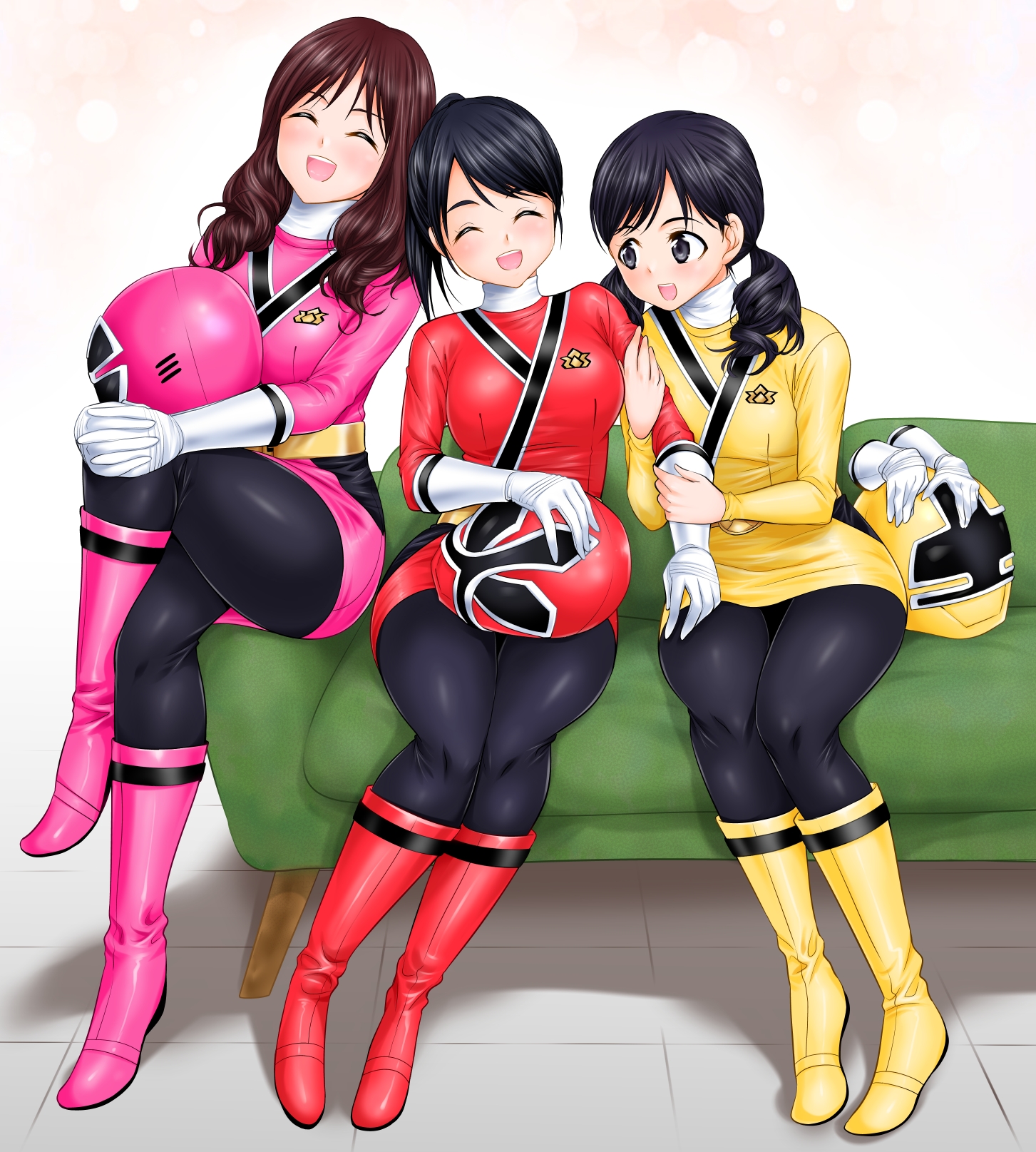 3girls abe_tsukumo belt black_hair bodysuit brown_hair couch gold_belt grey_eyes hanaori_kotoha helmet highres holding holding_unworn_helmet multiple_girls samurai_sentai_shinkenger shiba_kaoru shiraishi_mako super_sentai unworn_headwear unworn_helmet