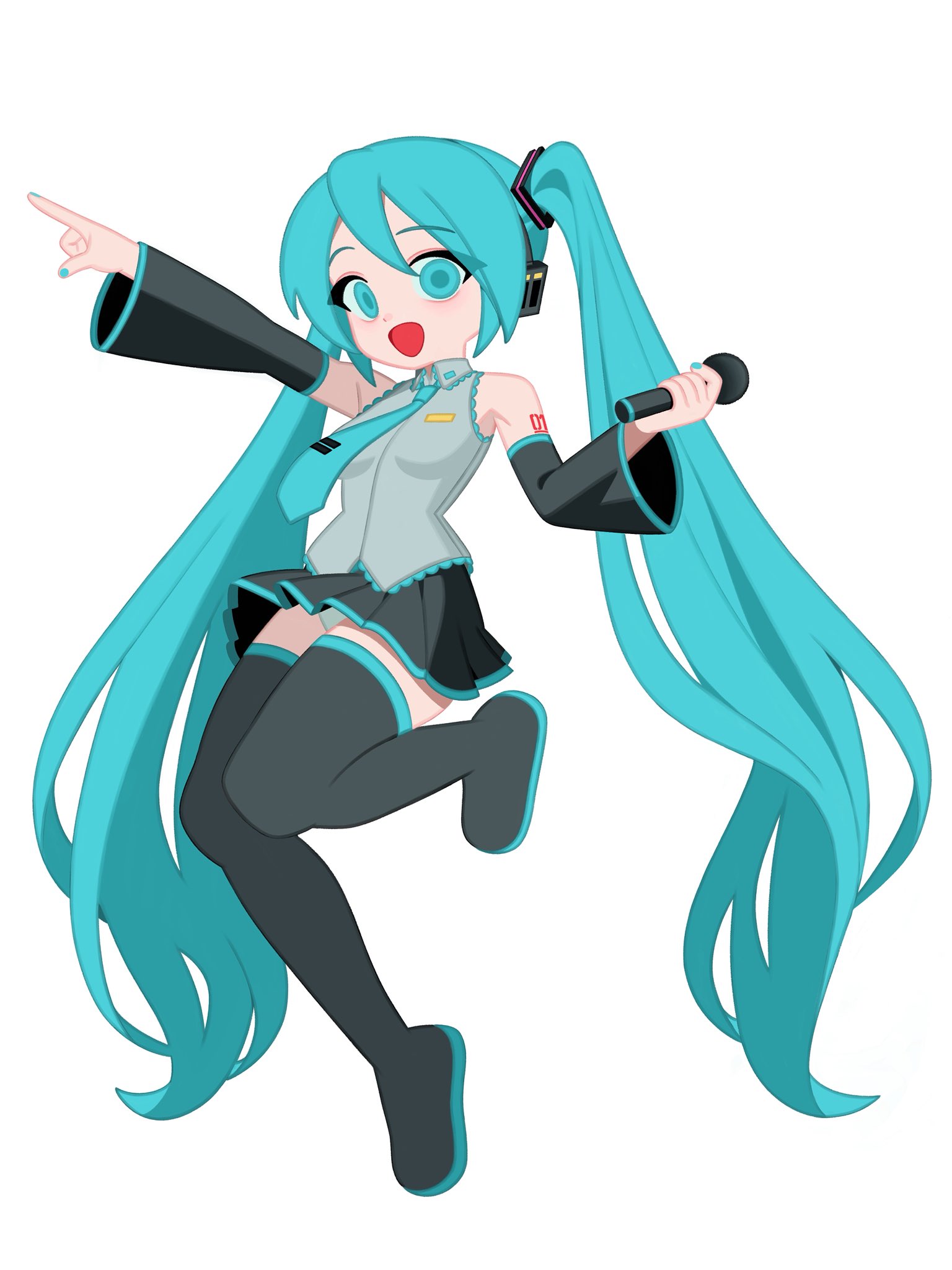 1girl bare_shoulders black_skirt black_sleeves black_thighhighs blue_eyes blue_hair blue_nails detached_sleeves full_body grey_shirt hatsune_miku highres holding holding_microphone long_hair long_sleeves microphone monster_l_(hochihochiha) pointing shirt simple_background skirt solo thighhighs twintails underwear very_long_hair vocaloid white_background wide_sleeves