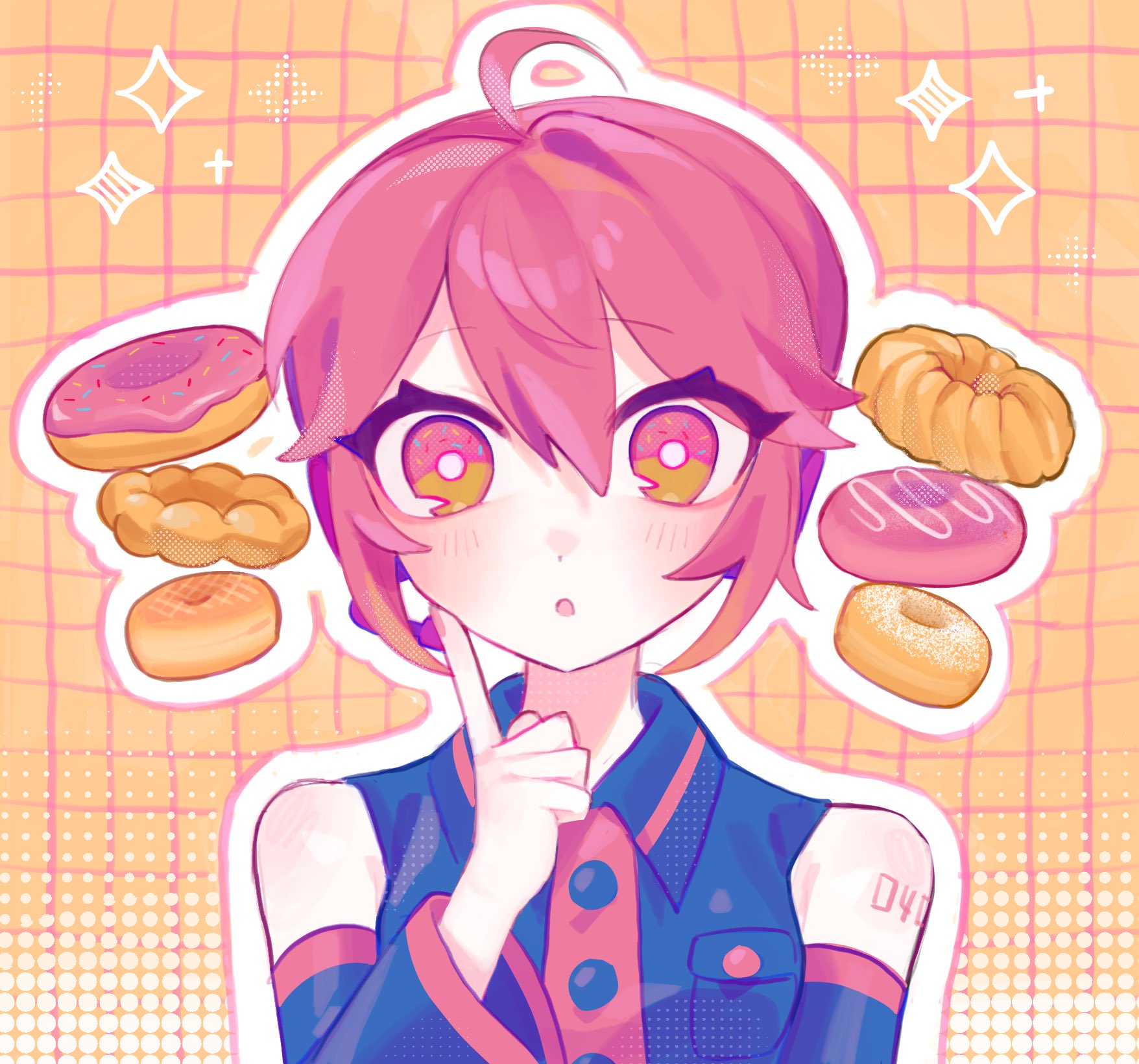 1girl bare_shoulders donut drill_hair finger_to_cheek food food-themed_hair hand_up highres kasane_teto looking_at_viewer nupi_(tpshye7d2k42552) parted_lips red_hair shirt sleeveless sleeveless_shirt solo twin_drills utau