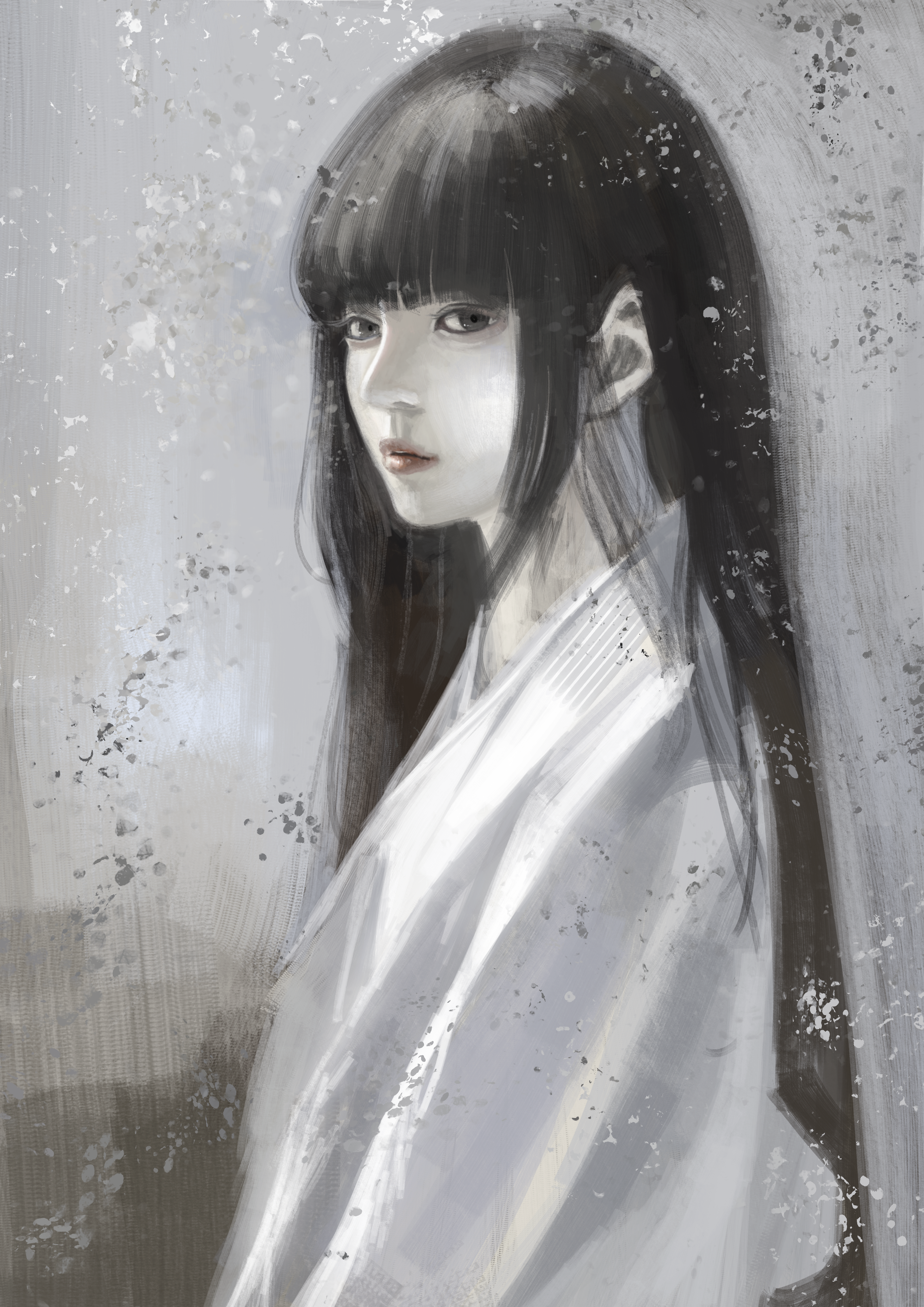 1girl absurdres asaki_(asaki_vision) black_eyes black_hair blunt_bangs commentary east_asian english_commentary eyelashes grey_background highres hime_cut long_hair original parted_lips red_lips robe solo standing upper_body white_robe