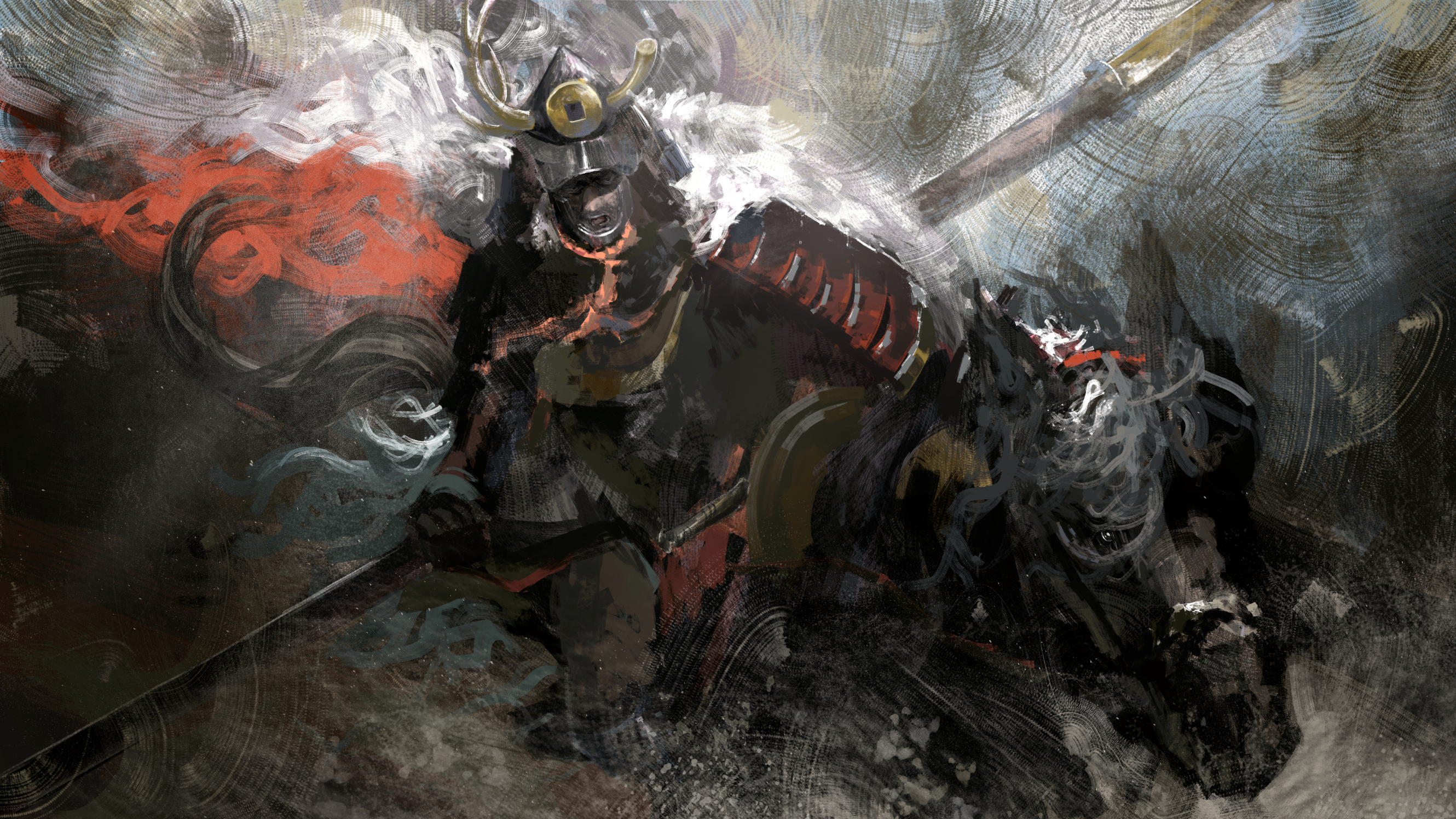 1boy armor asaki_(asaki_vision) boss_fight commentary_request gyoubu_masataka_oniwa helmet highres holding holding_polearm holding_weapon horseback_riding japanese_armor kabuto_(helmet) kote male_focus open_mouth polearm riding samurai sekiro:_shadows_die_twice solo weapon