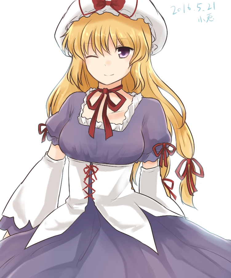 1girl alternate_headwear blonde_hair bow breasts closed_mouth dated detached_sleeves dress dress_ribbon frills hair_between_eyes hair_ribbon hat hat_bow koto_(shiberia39) long_dress long_hair looking_at_viewer mob_cap neck_ribbon one_eye_closed puffy_short_sleeves puffy_sleeves purple_dress purple_eyes red_bow red_ribbon ribbon shirt_ribbon short_sleeves smile solo touhou white_hat yakumo_yukari