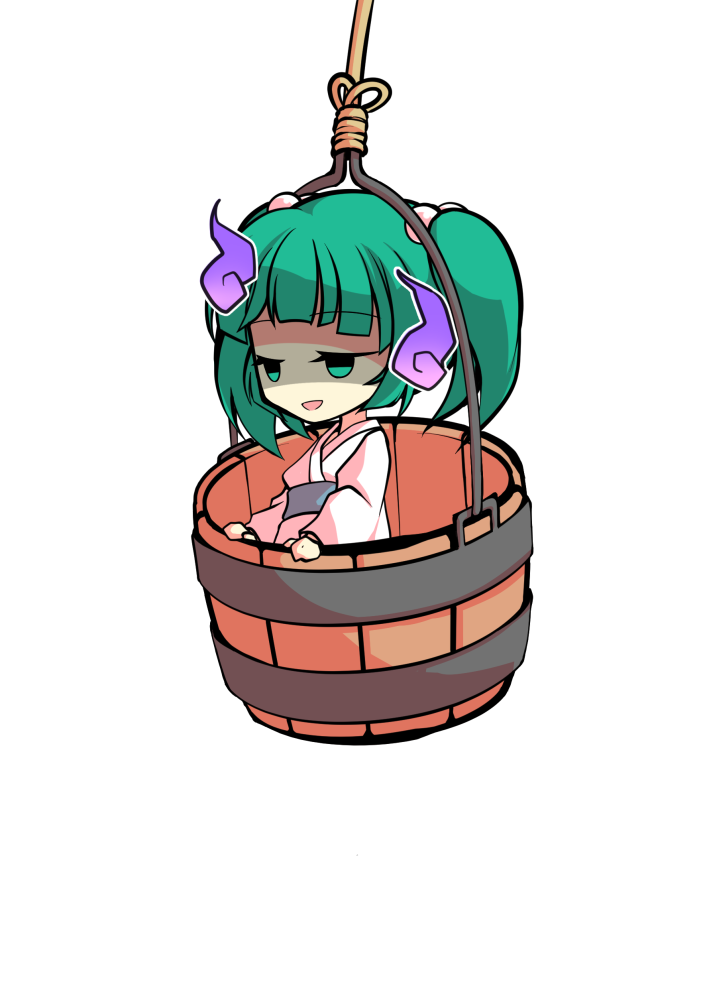 1girl bucket chibi chibi_only commentary_request dairi full_body green_eyes green_hair in_bucket in_container japanese_clothes kimono kisume large_variant_set medium_hair solo tachi-e touhou transparent_background twintails upper_body variant_set white_kimono wooden_bucket yukata