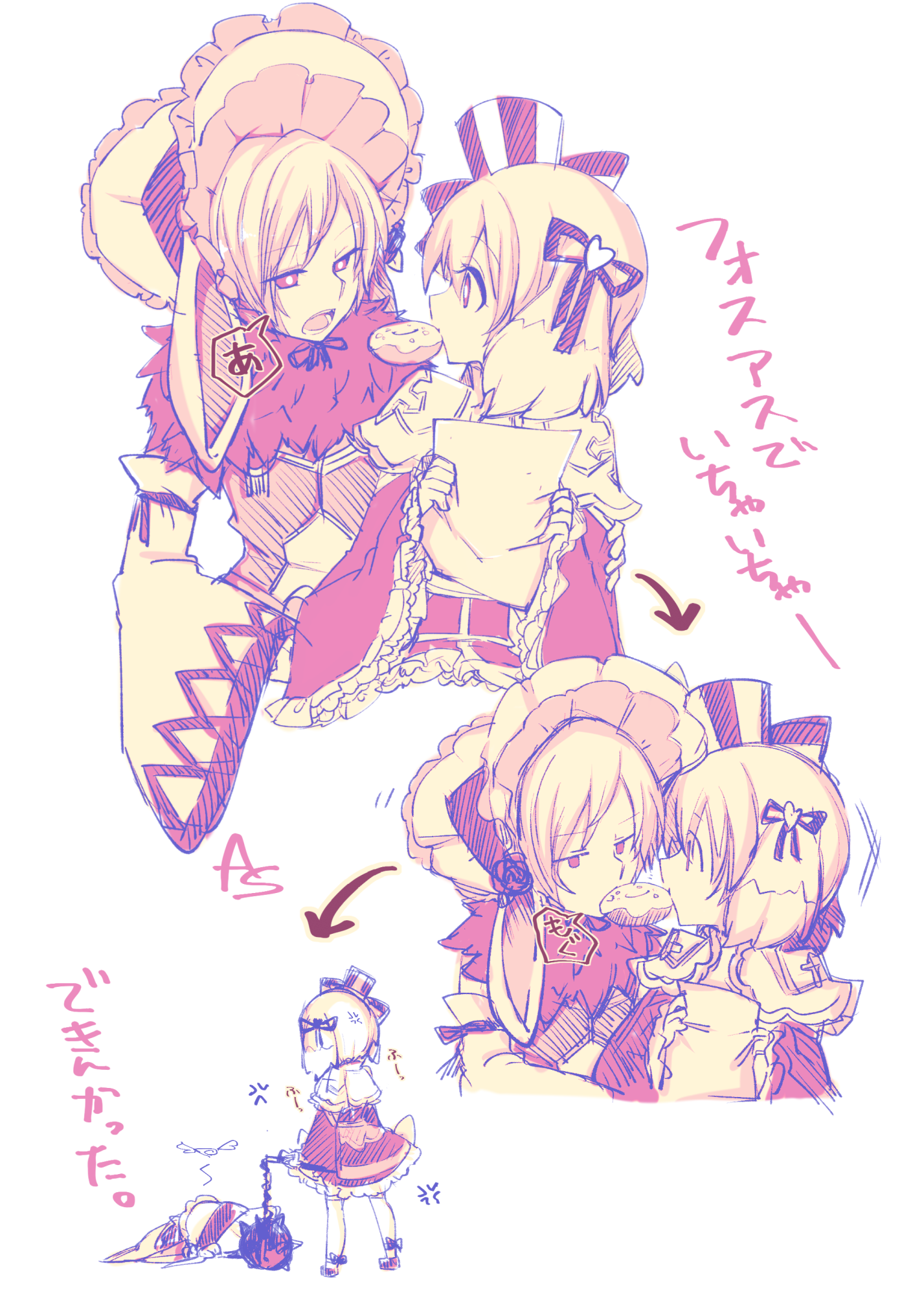 1boy 1girl anger_vein arch_bishop_(ragnarok_online) asuta_(kinakomoti300) ball_and_chain_(weapon) commentary_request detached_sleeves donut food frilled_sleeves frills fur_collar giving_up_the_ghost hair_ribbon hat highres holding holding_weapon looking_at_another monochrome official_alternate_costume open_mouth pink_theme ragnarok_online ribbon shared_food shirt short_hair simple_background sleeveless sleeveless_shirt sorcerer_(ragnarok_online) spiked_ball_and_chain top_hat translation_request upper_body weapon white_background