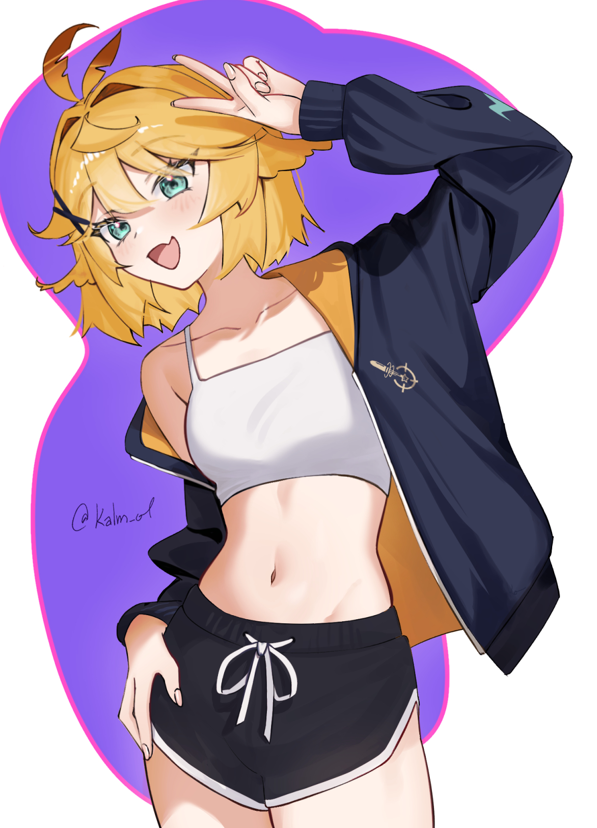 1girl arm_up black_jacket black_shorts blonde_hair collarbone commentary cowboy_shot crop_top dokibird dolphin_shorts english_commentary fang feather_hair feathers fingernails green_eyes groin hair_ornament hand_on_own_hip highres hood hooded_jacket indie_virtual_youtuber jacket kalm_ol midriff navel open_clothes open_jacket open_mouth purple_background short_hair shorts signature simple_background skin_fang smile tank_top twitter_username v virtual_youtuber white_background white_tank_top x_hair_ornament