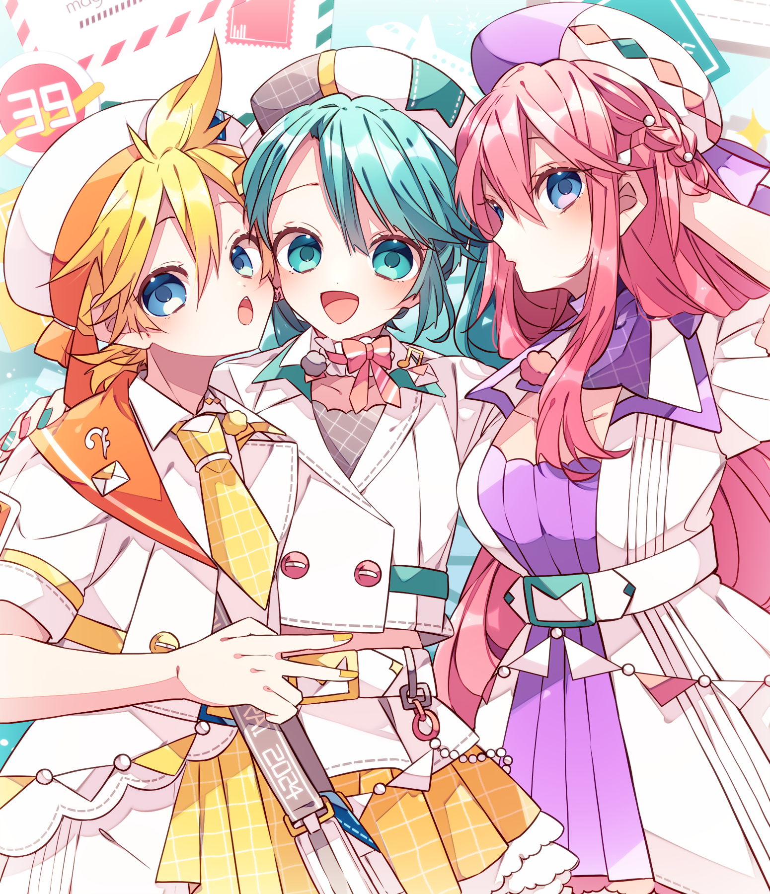 1boy 2girls 39 :d arm_up blonde_hair blue_eyes blue_hair bow bow_choker choker collared_shirt commentary_request cowboy_shot double-parted_bangs dress frilled_choker frills green_eyes hair_between_eyes hat hatsune_miku highres jacket kagamine_len kaho_0102 long_hair looking_at_viewer magical_mirai_len magical_mirai_len_(2024) magical_mirai_luka magical_mirai_luka_(2024) magical_mirai_miku magical_mirai_miku_(2024) megurine_luka multiple_girls nail_polish necktie open_mouth pink_choker pink_hair plaid_clothes plaid_necktie plaid_skirt pleated_skirt purple_dress shirt short-sleeved_jacket short_hair short_sleeves skirt smile v vocaloid white_hat white_jacket white_shirt yellow_nails yellow_necktie yellow_skirt
