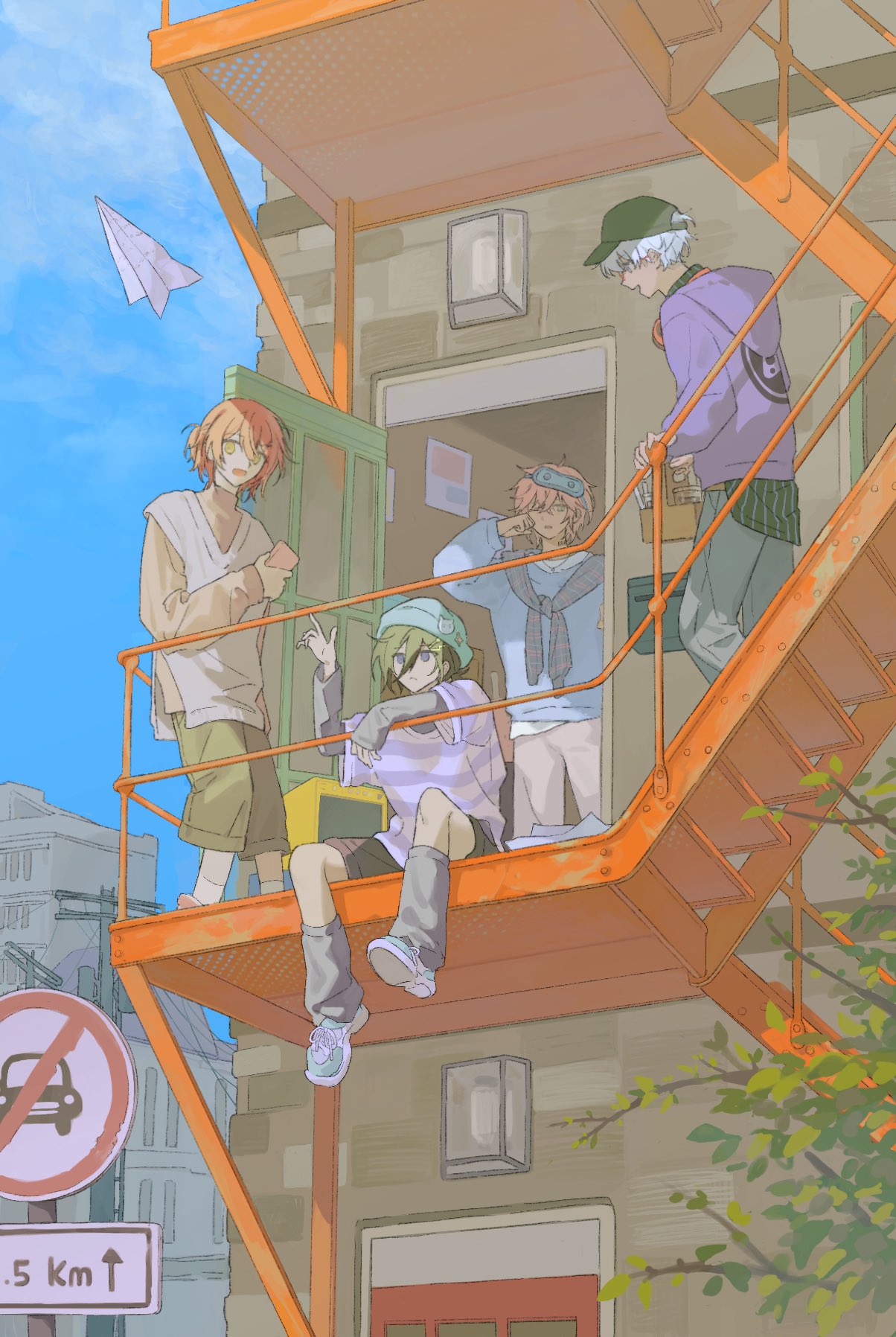 4boys arurandeisu baggy_clothes beanie black_hair blue_sky building full_body green_eyes grey_hair hair_between_eyes hanasaki_miyabi hashtag-only_commentary hat headphones headphones_around_neck highres holostars k_o_r_e kanade_izuru long_sleeves loose_socks male_focus multiple_boys on_stairs open_door pants paper_airplane pink_hair purple_eyes red_hair rikka_(holostars) road_sign scenery shirt short_hair shorts sign sitting sitting_on_stairs sky sleepy smile socks stairs standing tree virtual_youtuber yellow_eyes