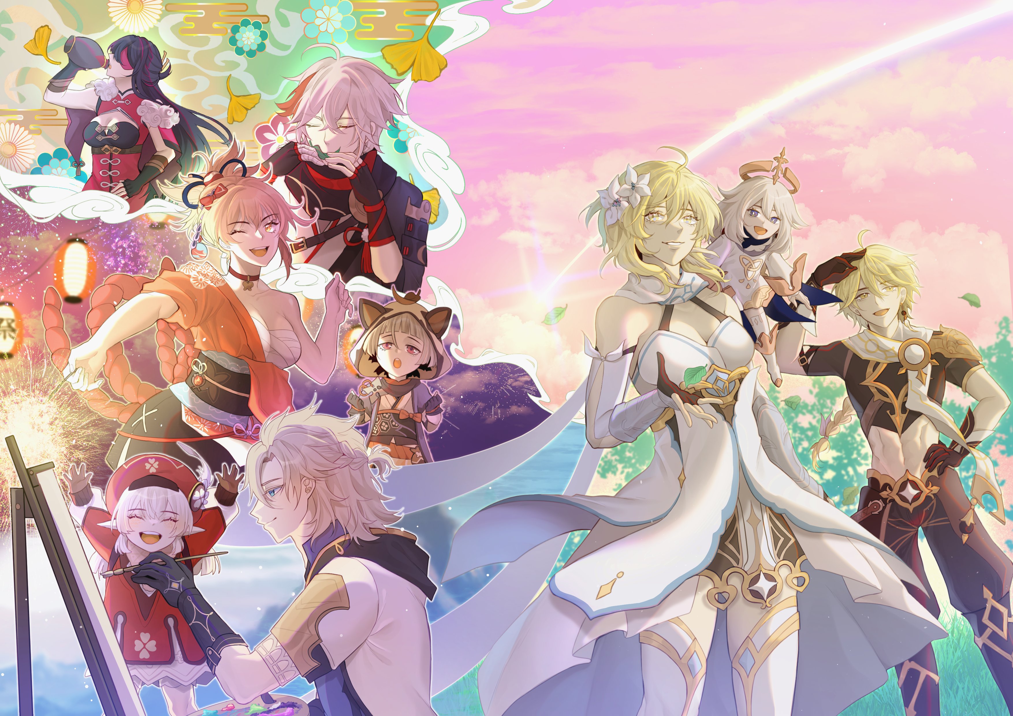 3boys 6+girls absurdres aether_(genshin_impact) ahoge albedo_(genshin_impact) animal_ears animal_print antenna_hair arm_armor arm_up armor arms_up baggy_pants bare_shoulders beidou_(genshin_impact) belt beret black_belt black_boots black_choker black_gloves black_ribbon black_scarf black_shirt blonde_hair blue_eyes blue_shirt boots bow braid breasts bright_pupils brother_and_sister brown_gloves brown_pants brown_shirt butterfly_choker butterfly_print china_dress chinese_clothes chinese_hairpin choker cleavage_cutout clenched_hand clenched_hands clothing_cutout cloud cloudy_sky clover_print colored_eyepatch commentary covered_navel cowboy_shot detached_sleeves dress drinking earrings easel egasumi english_commentary evening eyepatch feather_hair_ornament feathers fingerless_gloves fingernails floating_clothes flower flying fur-trimmed_sleeves fur_collar fur_trim gem genshin_impact ginkgo_leaf gloves gold_trim gourd gradient_sky grass green_hair hair_between_eyes hair_bow hair_flower hair_ornament hair_ribbon hair_stick half-closed_eyes halo hand_on_own_hip hand_up happy hat hat_ornament highres holding holding_fireworks holding_gourd holding_leaf holding_paint_palette holding_paintbrush hood hoodie jacket japanese_clothes jewelry kaedehara_kazuha kikkoumon kimono klee_(genshin_impact) lantern leaf leaf_on_head long_hair long_sleeves looking_at_object looking_at_viewer looking_to_the_side looking_up low-braided_long_hair low-tied_long_hair low_twintails lumine_(genshin_impact) mandarin_collar mechanical_halo medium_breasts midriff multicolored_hair multiple_boys multiple_girls ninja obijime ocean one_eye_closed open_clothes open_hoodie open_jacket open_mouth orange_bow orange_gem orange_kimono outdoors paimon_(genshin_impact) paint_palette paintbrush painting_(action) pants partially_fingerless_gloves pink_sky pointy_ears pom_pom_(clothes) ponytail puffy_long_sleeves puffy_sleeves purple_eyes purple_jacket puyurin raccoon_ears raccoon_girl rainbow red_bow red_dress red_hair red_hat red_ribbon ribbon romper rope sarashi sayu_(genshin_impact) scarf shirt short_hair short_ponytail short_sleeves shoulder_armor siblings sidelocks single_braid single_earring sky sleeveless sleeveless_dress smile standing star_(symbol) streaked_hair tassel teeth thigh_boots twintails two-tone_dress two-tone_shirt upper_body vision_(genshin_impact) white_boots white_dress white_flower white_hair white_hoodie white_pupils white_ribbon white_romper white_shirt white_sleeves yellow_eyes yellow_hood yoimiya_(genshin_impact)