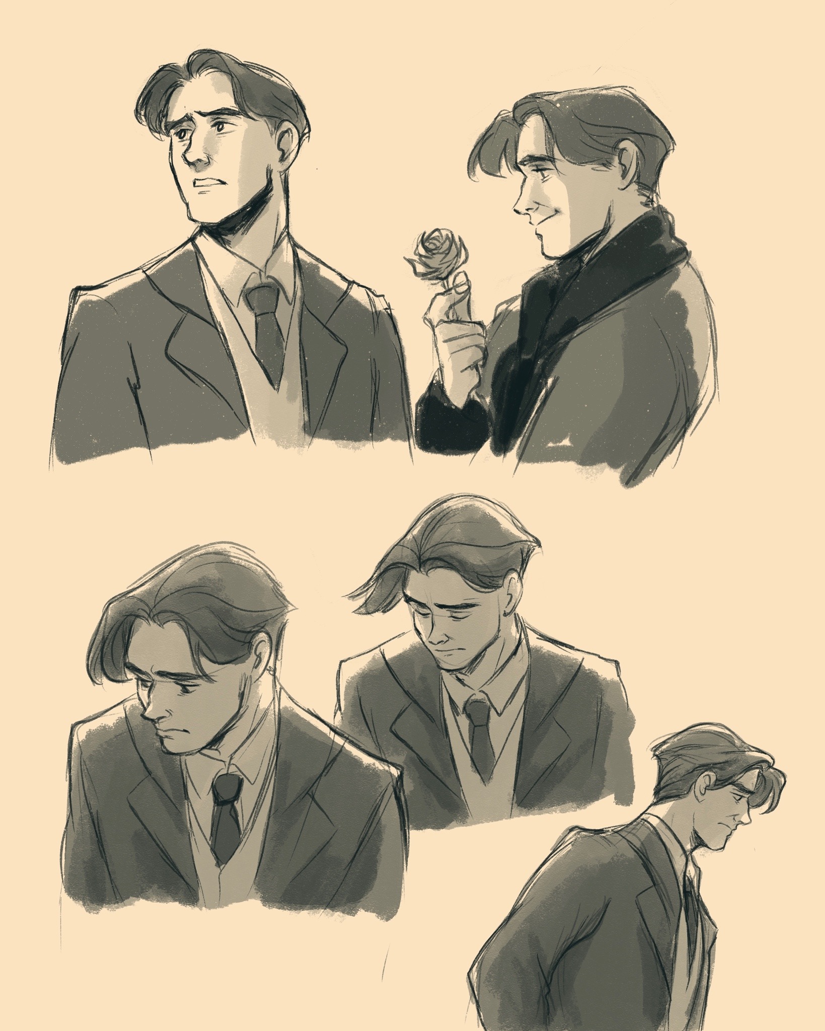 1boy anastasia_(1997) closed_mouth collared_shirt commentary dimitri_(anastasia) english_commentary flower formal_clothes greyscale highres holding holding_flower monochrome multiple_views necktie parted_lips pinkpiggy93 rose shirt short_hair simple_background smile suit upper_body