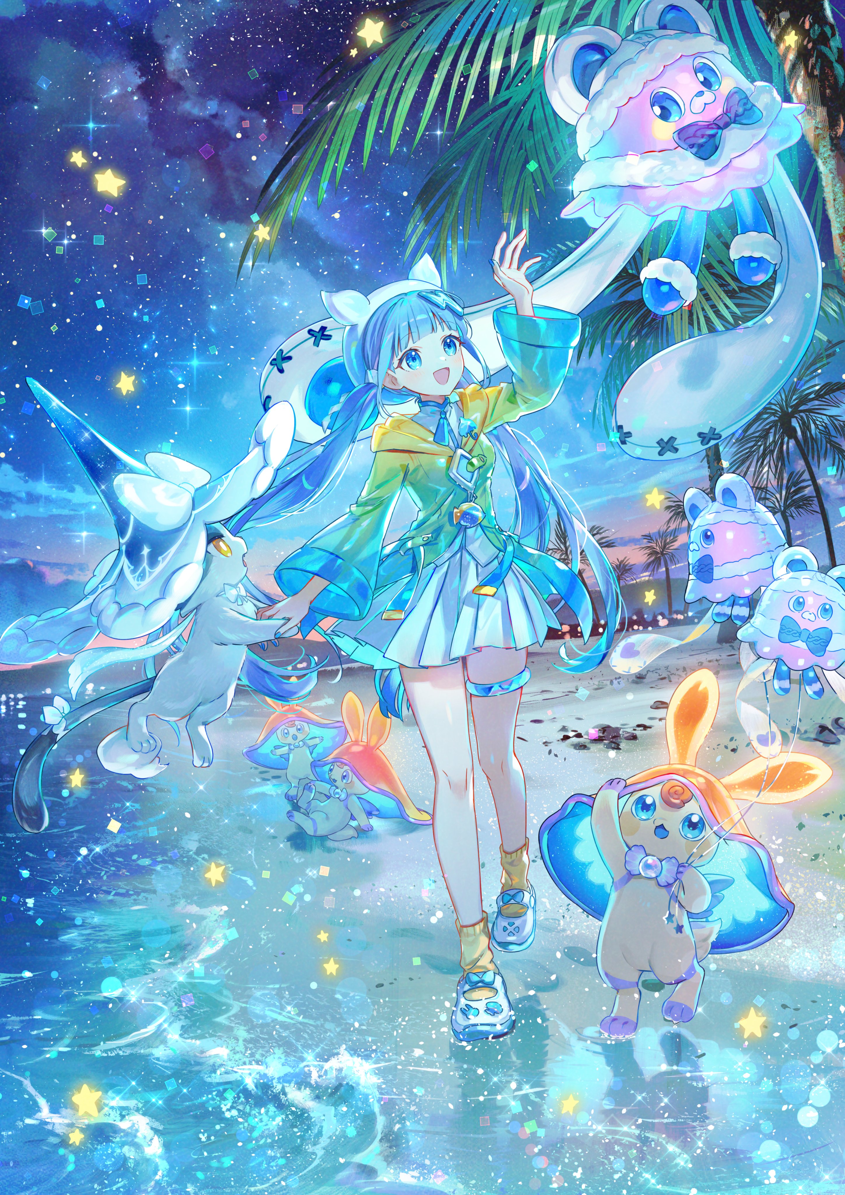 1girl absurdres beach blue_eyes blue_hair bunmareen_(honkai:_nexus_anima) character_request creature highres honkai:_nexus_anima honkai_(series) nanafey_(honkai:_nexus_anima) naru_(andante) night ocean palm_tree thigh_strap tree twintails