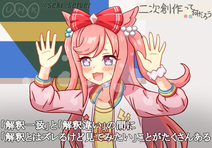 1girl agnes_digital_(casual)_(umamusume) agnes_digital_(umamusume) animal_ears blue_eyes blush bow choker commentary_request ear_ornament hair_bow hair_ornament hands_up horse_ears horse_girl jacket jojifuku long_hair looking_at_viewer nhk_(broadcaster) open_clothes open_jacket open_mouth pink_hair pink_sleeves scrunchie seki_(hyokosho) shirt smile solo sweat translation_request umamusume upper_body wrist_scrunchie yellow_shirt