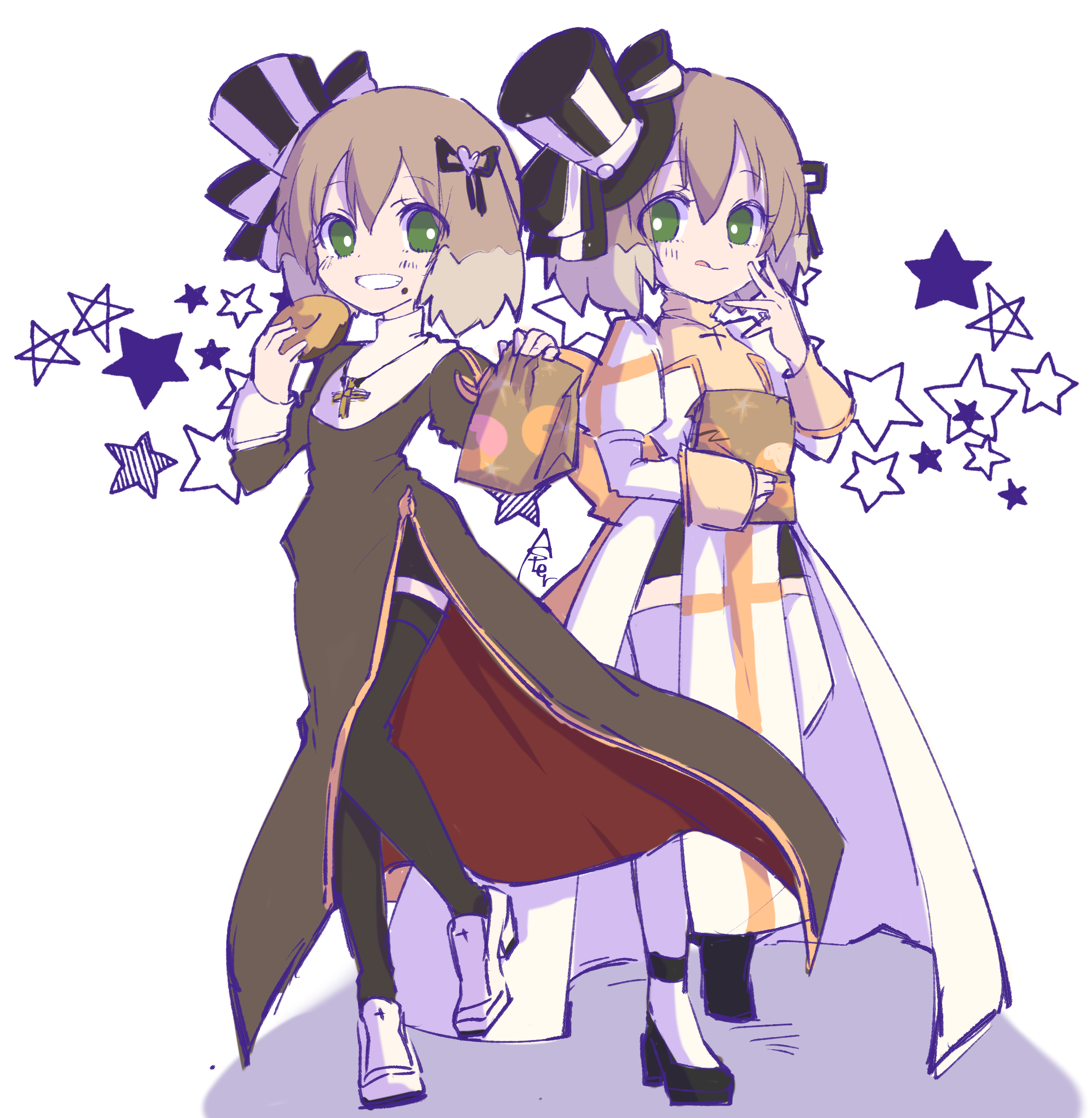 1girl :q absurdres age_progression asuta_(kinakomoti300) bag black_dress black_hat black_shoes black_thighhighs brown_hair closed_mouth commentary_request cross cross_necklace donut dress food full_body green_eyes grin hat high_priest_(ragnarok_online) highres jewelry juliet_sleeves long_sleeves looking_at_viewer necklace paper_bag priest_(ragnarok_online) puffy_sleeves ragnarok_online shoes short_hair simple_background smile star_(symbol) striped_hat thighhighs tongue tongue_out top_hat white_background white_dress white_hat white_shoes white_thighhighs