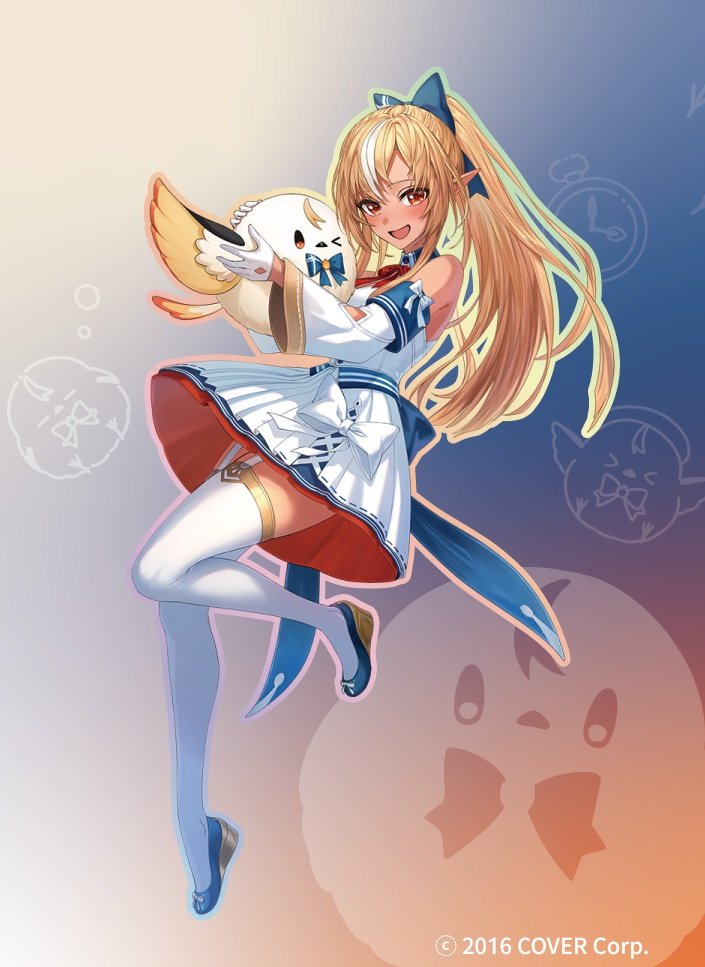 >_o :d animal blonde_hair blue_bow blue_shoes bow bowtie commentary_request copyright_notice dark-skinned_female dark_skin detached_collar detached_sleeves dress dress_bow elf elfriend_(shiranui_flare) full_body garter_straps gloves hair_bow half_gloves high_ponytail holding holding_animal hololive long_hair long_sidelocks looking_at_viewer multicolored_hair nonon_813 official_art one_eye_closed open_mouth pleated_dress pointy_ears ponytail red_bow red_bowtie shiranui_flare shiranui_flare_(1st_costume) shoes sidelocks smile streaked_hair thighhighs virtual_youtuber white_dress white_garter_straps white_gloves white_sleeves white_thighhighs wide_sleeves