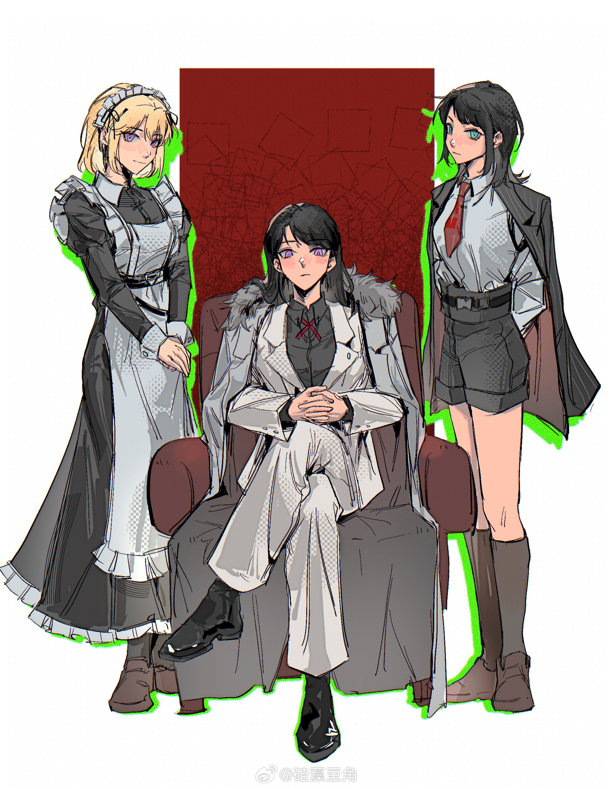 3girls absurdres apron arknights armchair arms_behind_back bang_dream! bang_dream!_it's_mygo!!!!! black_dress black_hair black_jacket black_shirt black_shoes black_shorts blonde_hair brown_shoes chair chinese_commentary closed_mouth commentary_request crossed_legs dress formal_clothes frilled_apron frills full_body gui_zao_doujiao highres interlocked_fingers jacket jacket_on_shoulders long_hair long_sleeves looking_at_viewer maid maid_headdress medium_hair misumi_uika mole mole_under_eye multiple_girls necktie own_hands_together pants purple_eyes red_necktie shiina_taki shirt shoes short_hair shorts sitting smile standing suit watermark weibo_watermark white_apron white_jacket white_pants white_shirt yahata_umiri