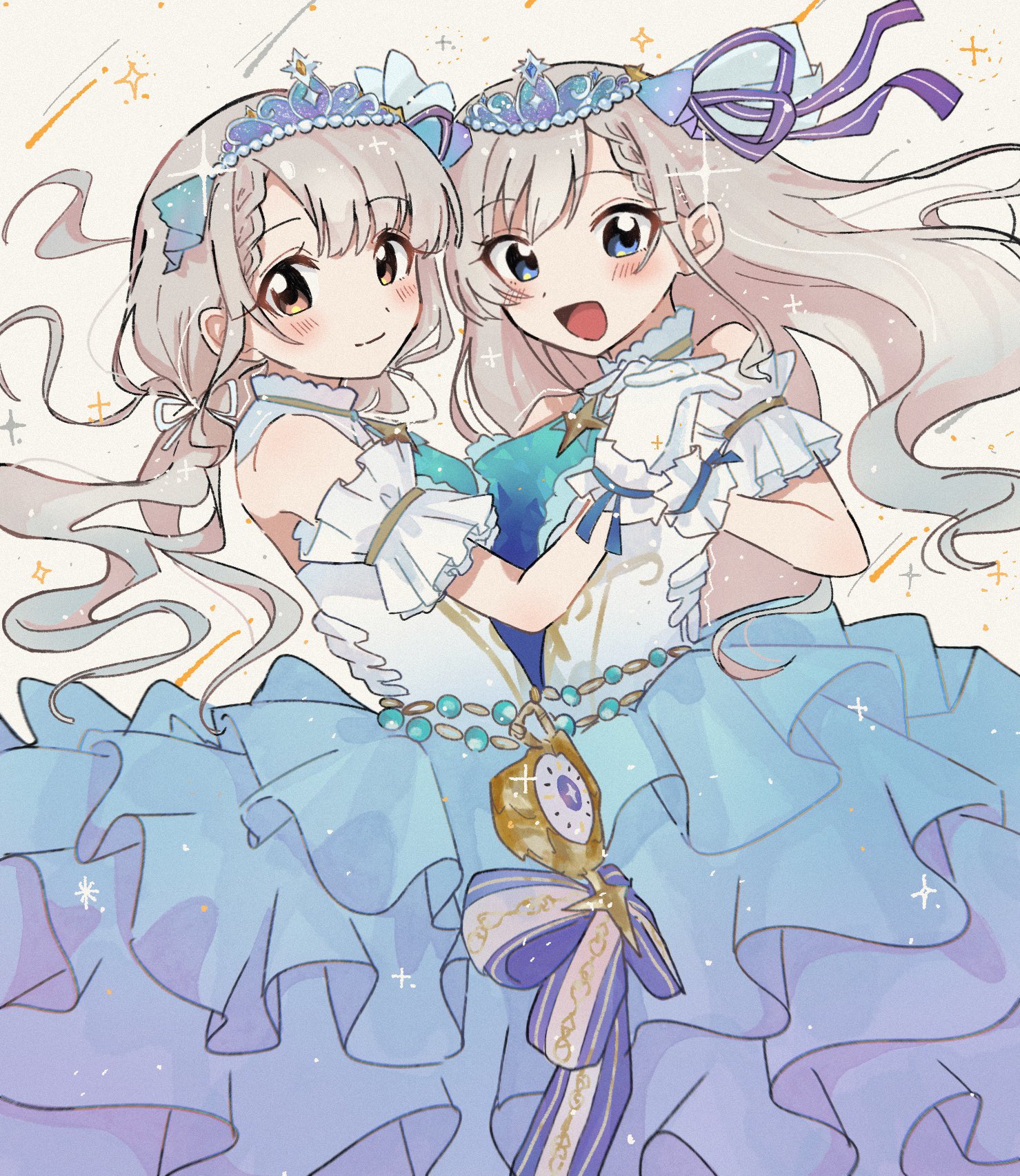 2girls arm_garter bare_shoulders blue_dress blue_eyes blue_skirt blush braid braided_bangs breasts brooch brown_eyes closed_mouth dot_nose dress floating_hair glint gloves grey_hair hair_ornament hair_ribbon hand_on_another's_waist highres hisakawa_hayate hisakawa_nagi holding_hands idolmaster idolmaster_cinderella_girls idolmaster_cinderella_girls_starlight_stage interlocked_fingers jewelry layered_skirt long_hair looking_at_viewer low_twintails medium_breasts multiple_girls open_mouth purple_ribbon ribbon siblings sisters skirt sleeveless sleeveless_dress smile sparkle star_brooch tiara twins twintails two-tone_dress very_long_hair white_background white_dress white_gloves white_ribbon yoshida_(hizi_ki04)