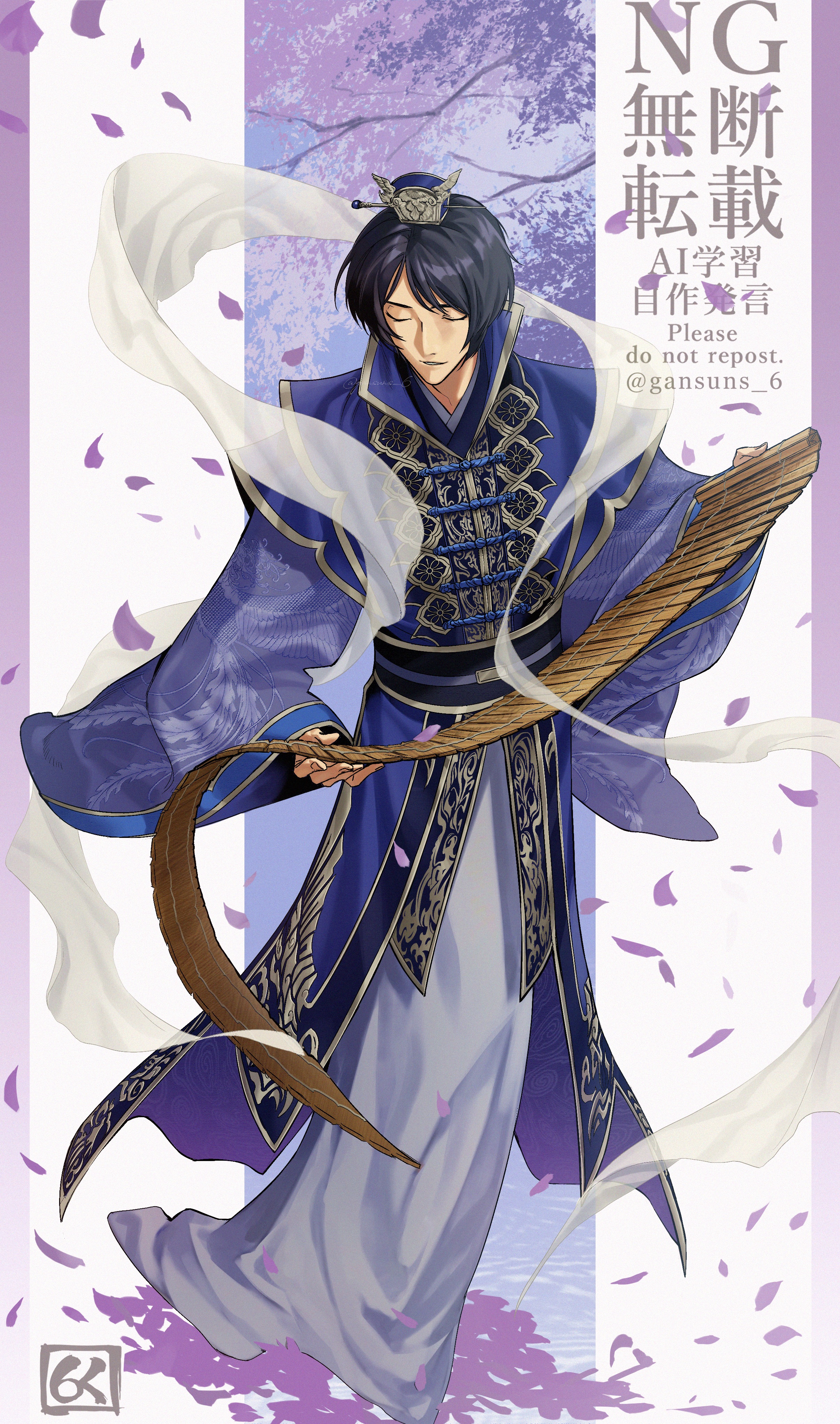 1boy absurdres black_hair blue_robe cao_zhi chinese_clothes chinese_hairpin closed_eyes falling_petals full_body gold_trim highres holding holding_scroll male_focus petals purple_petals robe roku_(gansuns) scarf scroll shin_sangoku_musou shin_sangoku_musou_blast short_hair solo twitter_username white_scarf wide_sleeves