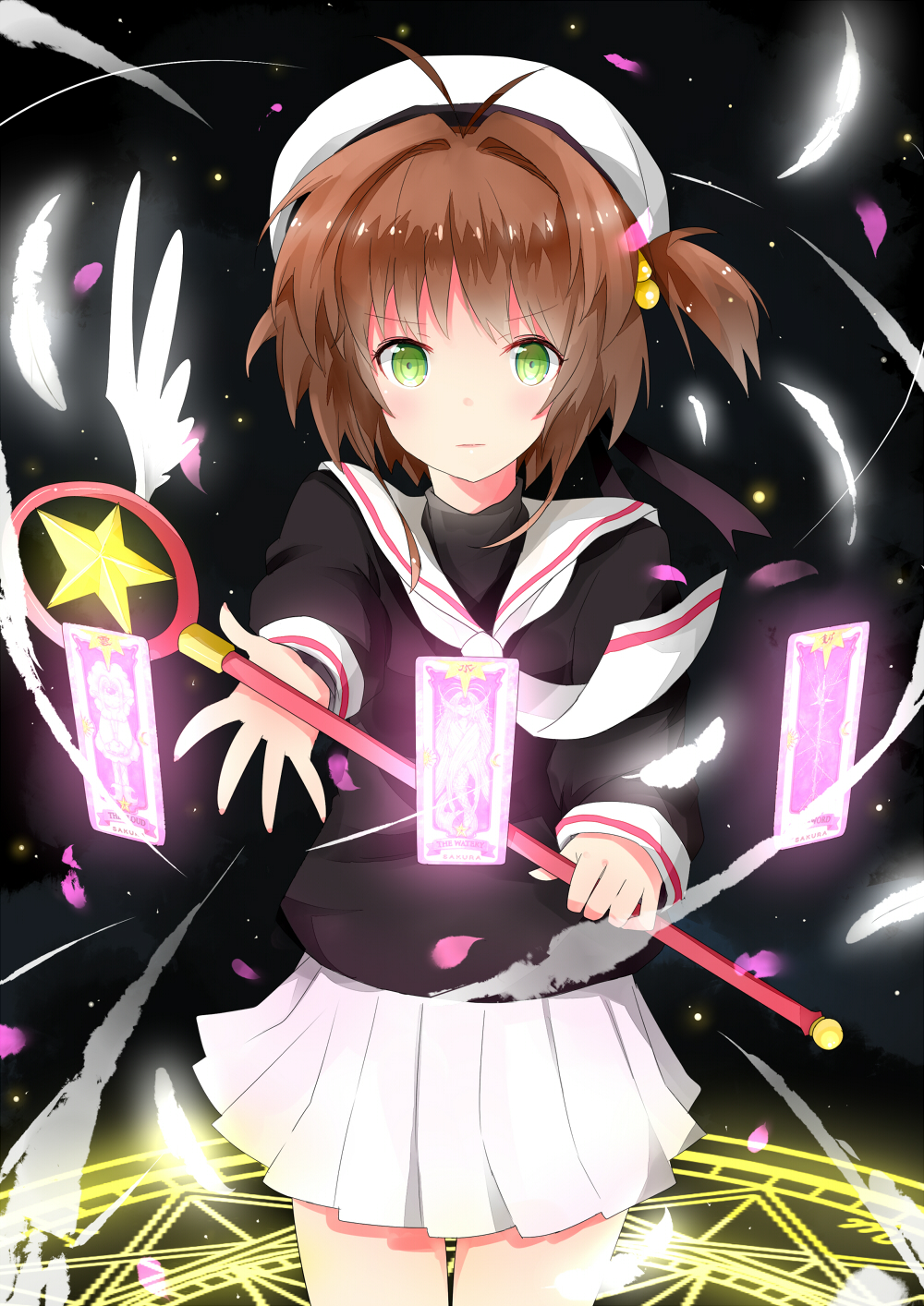 1990s_(style) 1girl brown_hair cardcaptor_sakura child cloud_(clow_card) clow_card female_focus floating_card green_eyes hat highres hoshi_no_tsue kinomoto_sakura magic_circle magical_girl r_star retro_artstyle sakura_card school_uniform serafuku solo sword_(clow_card) tomoeda_middle_school_uniform twintails wand watery_(clow_card) white_hat