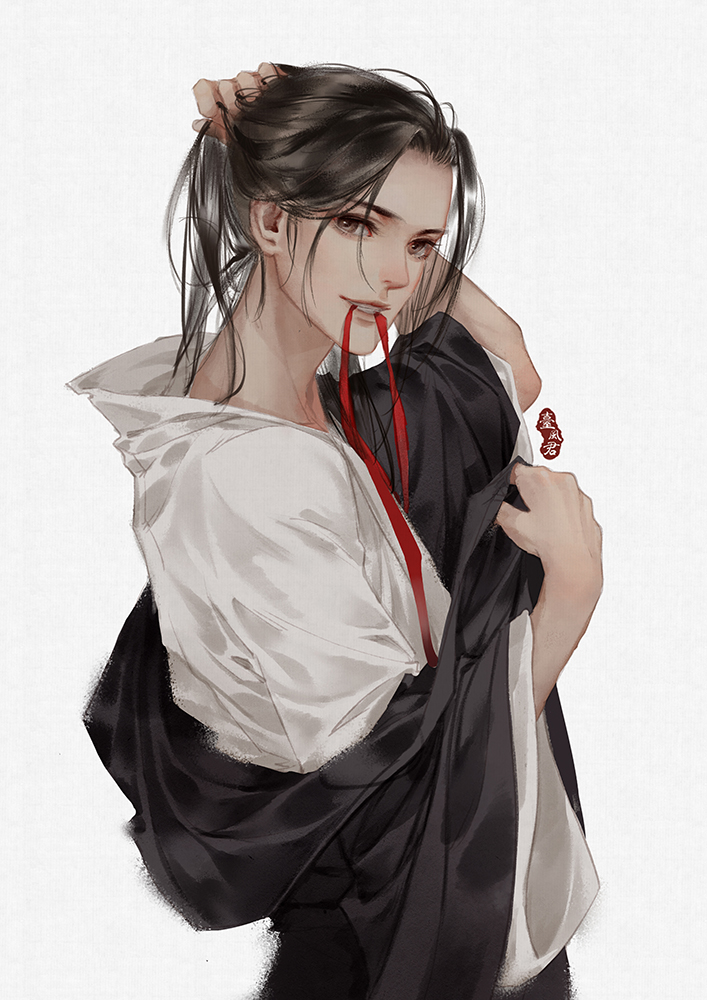 1boy artist_name black_eyes black_hair black_hanfu brown_eyes chinese_clothes chinese_commentary dressing eyelashes from_side hair_ribbon hand_on_own_head hand_up hanfu holding holding_own_hair long_hair long_sleeves looking_at_viewer male_focus modao_zushi mouth_hold off_shoulder parted_lips ponytail red_ribbon ribbon ribbon_in_mouth robe simple_background smile solo taifeng_jun_yijing_qi_zhi_le teeth_hold tying_hair upper_body wei_wuxian white_background white_robe wide_sleeves