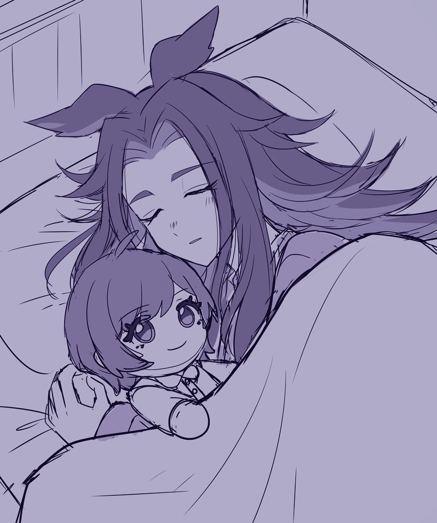1girl animal_ears bed blanket character_doll closed_eyes closed_mouth doll female_trainer_(umamusume) fenomeno_(umamusume) greyscale holding holding_doll horse_ears horse_girl long_hair long_sleeves monochrome pajamas pillow sa_420 shirt sleeping trainer_(umamusume) umamusume under_covers