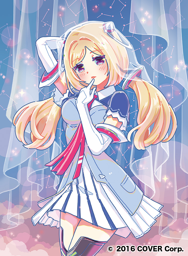 1girl aki_rosenthal aki_rosenthal_(1st_costume) arm_behind_head arm_up black_boots blonde_hair blue_jacket blue_shrug bob_cut boots breasts collared_dress commentary_request constellation curtains naturally_detached_hair dress elbow_gloves elf finger_to_mouth gloves hair_ornament hand_up headgear hiro046k hololive jacket long_hair looking_at_viewer low_twintails necktie official_art open_mouth parted_bangs parted_lips pleated_dress pleated_skirt pointing pointing_at_self pointy_ears purple_eyes red_necktie see-through_clothes see-through_veil short_dress short_hair short_sleeves shrug_(clothing) skirt solo thigh_boots twintails veil virtual_youtuber white_dress white_gloves