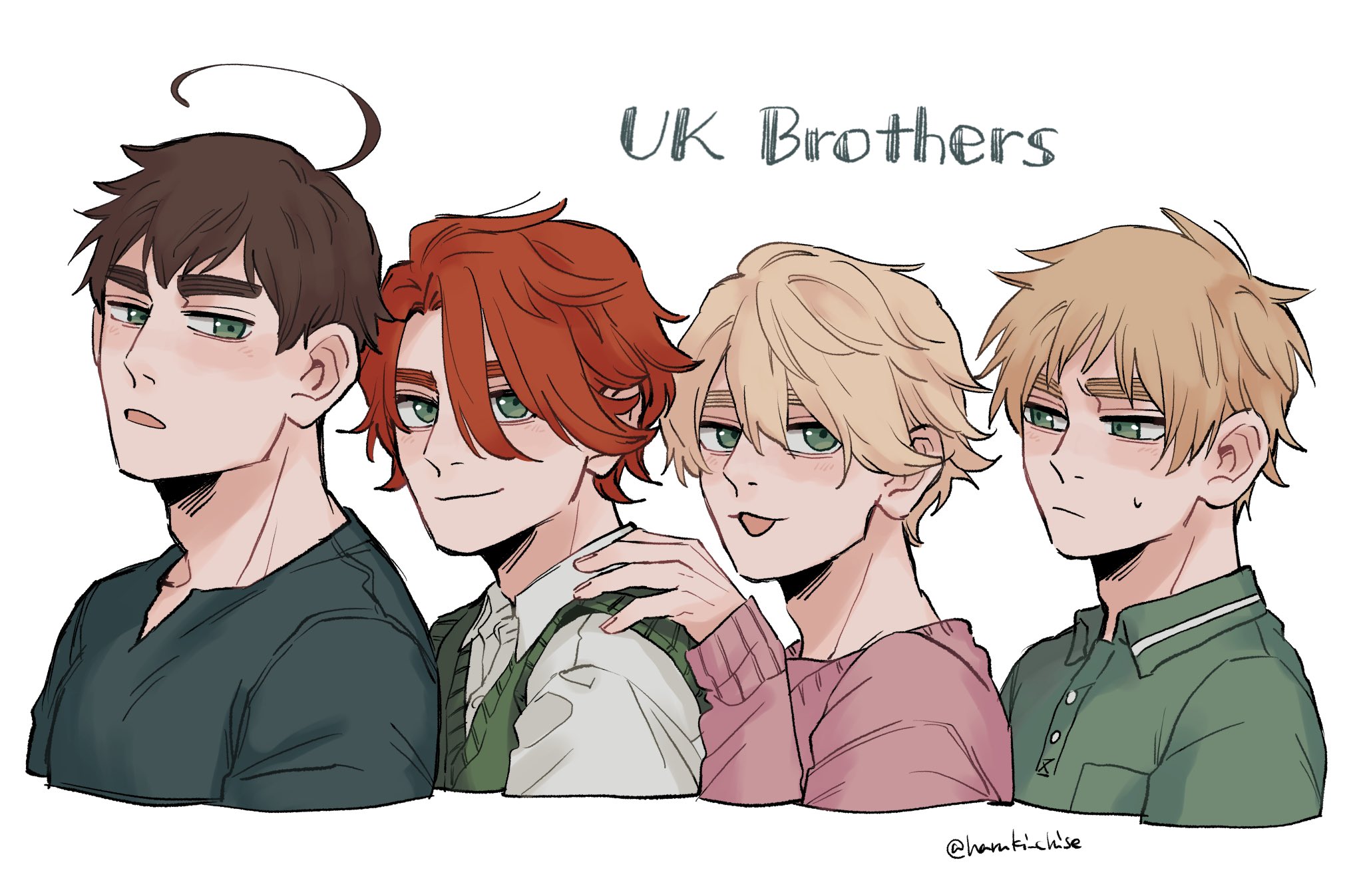 4boys ahoge artist_name axis_powers_hetalia black_shirt blonde_hair blush breast_pocket brown_hair buttons closed_mouth collared_shirt english_text fingernails green_eyes green_shirt green_sweater_vest hair_between_eyes hand_on_another's_shoulder hand_up haruki_chise highres huge_ahoge long_sleeves looking_at_another looking_at_viewer male_focus multiple_boys northern_ireland_(hetalia) open_mouth pink_sweater pocket puffy_long_sleeves puffy_sleeves red_hair scotland_(hetalia) shirt short_hair simple_background smile sweatdrop sweater sweater_vest united_kingdom_(hetalia) upper_body wales_(hetalia) white_background white_shirt